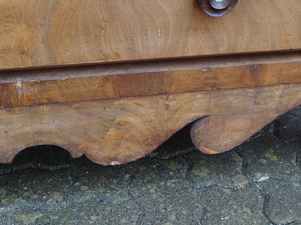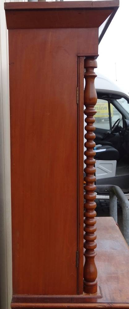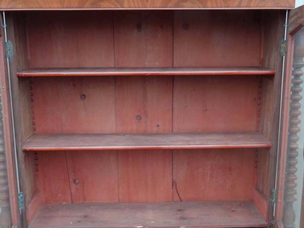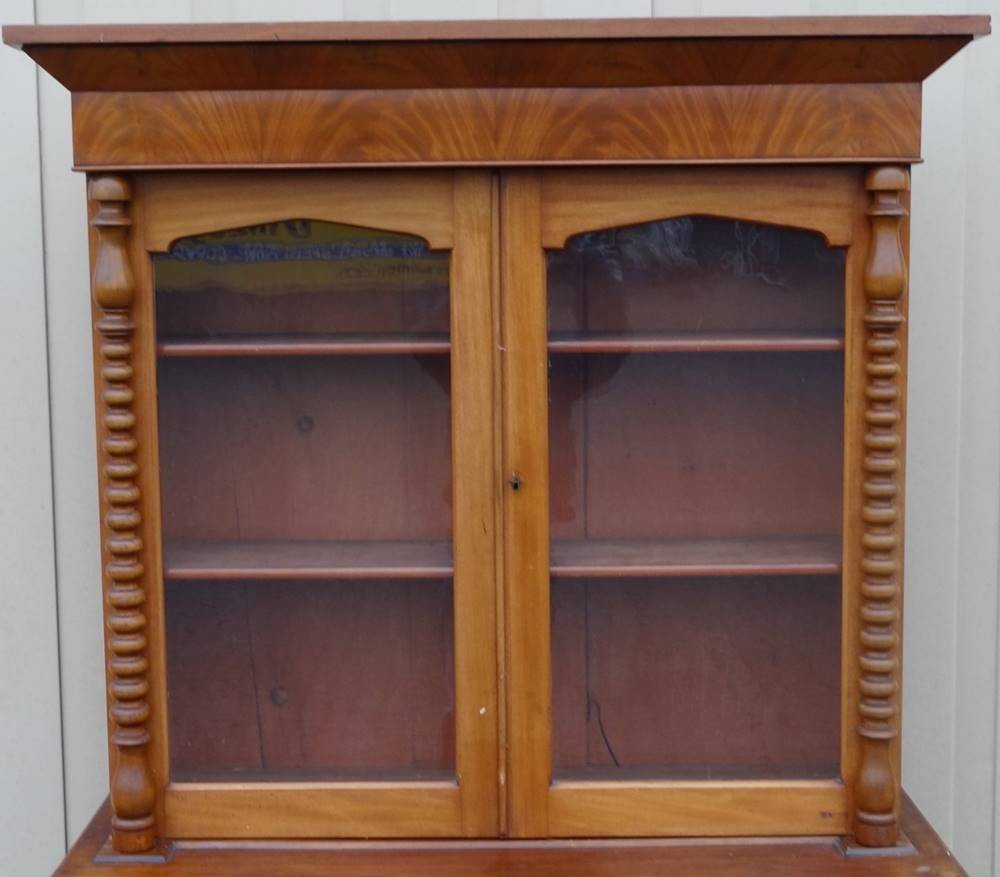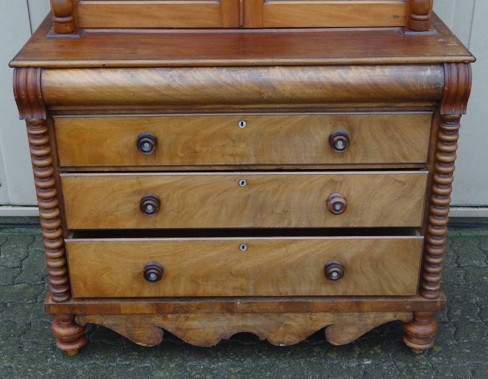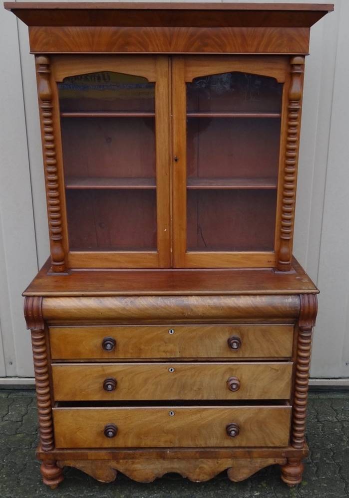 Biedermeier-Aufsatzvitrine mit Zopfsäulen, Mahagonifurniert, restaurierungsbedürftig, Alters-u. Gebrauchsspuren (ohne Inhalt),H-115cm,t-60cm,b-125cm [1]