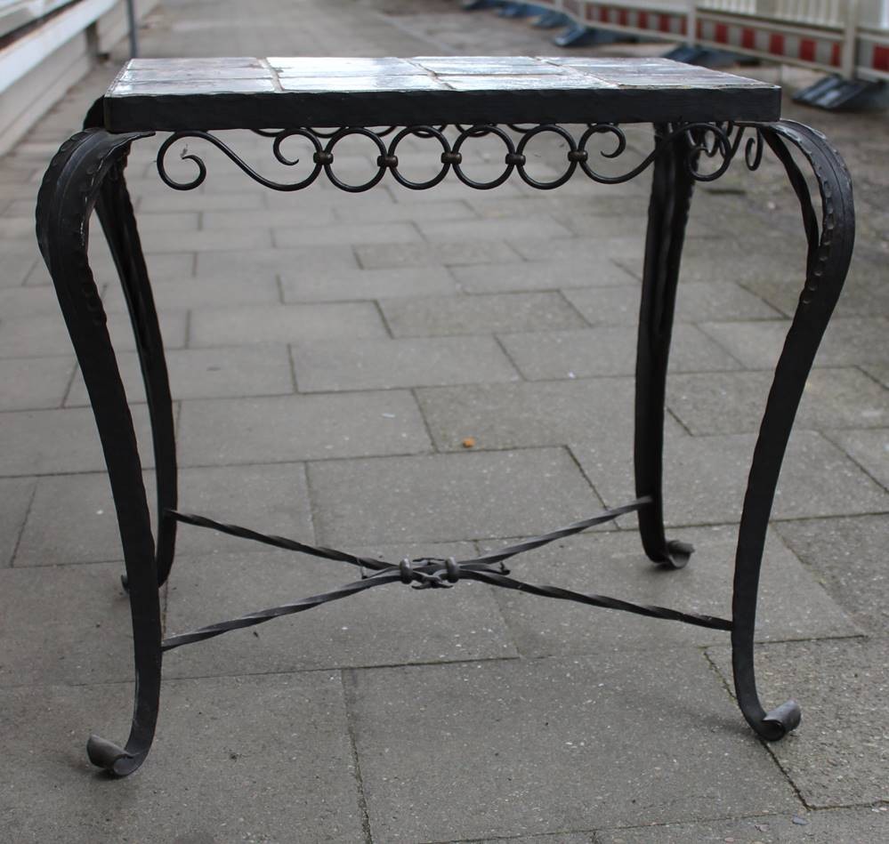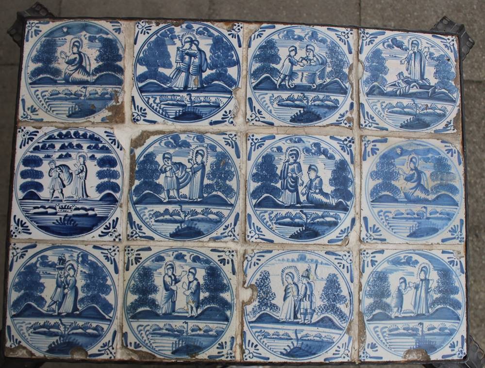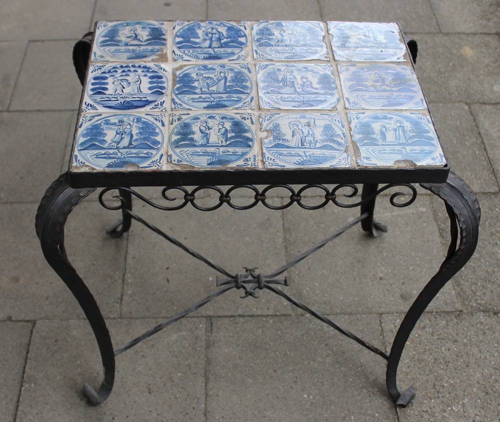Fliesentisch mit 12 antiken Fliesen, bibl. Szenen, Gestell aus Gusseisen, Fliesen teilw. beschädigt, H-58cm B-63cm T-49cm [1]