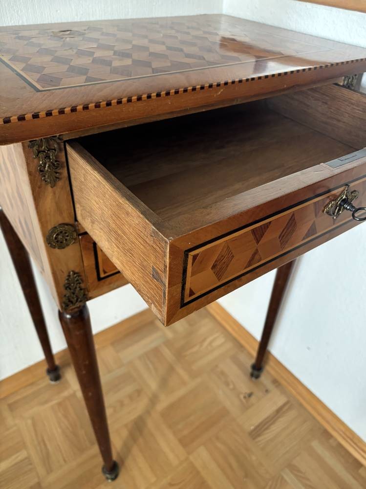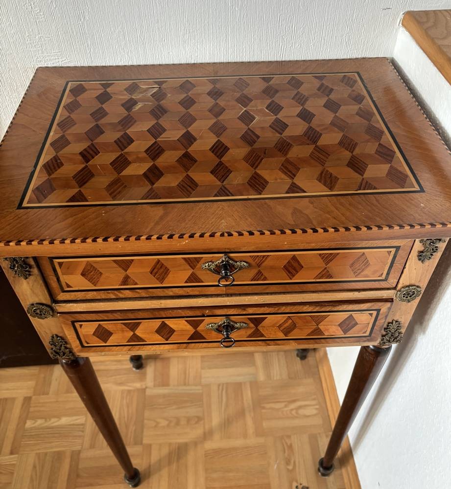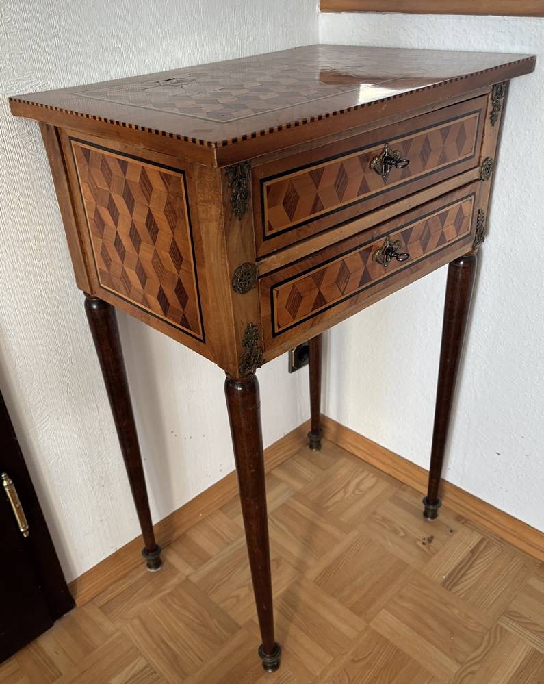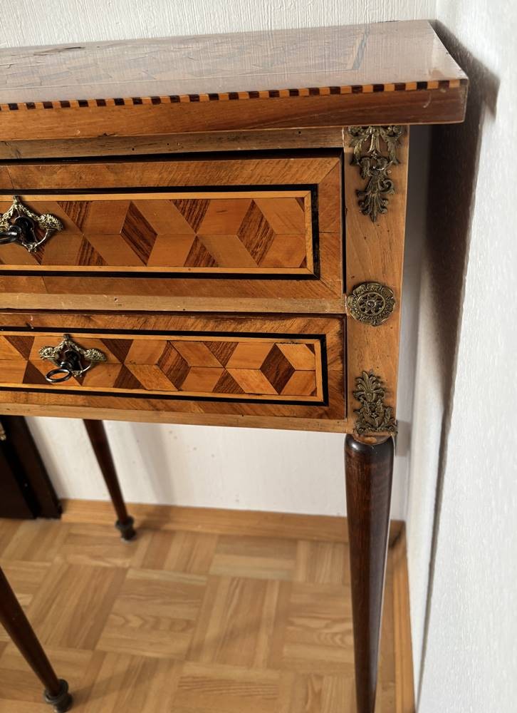 Frz. Beistelltisch, Louis XVI, Edelhözer intarsiert, 2 Schubladen, guter Zustand, H-89 cm, 57x41 cm [1]