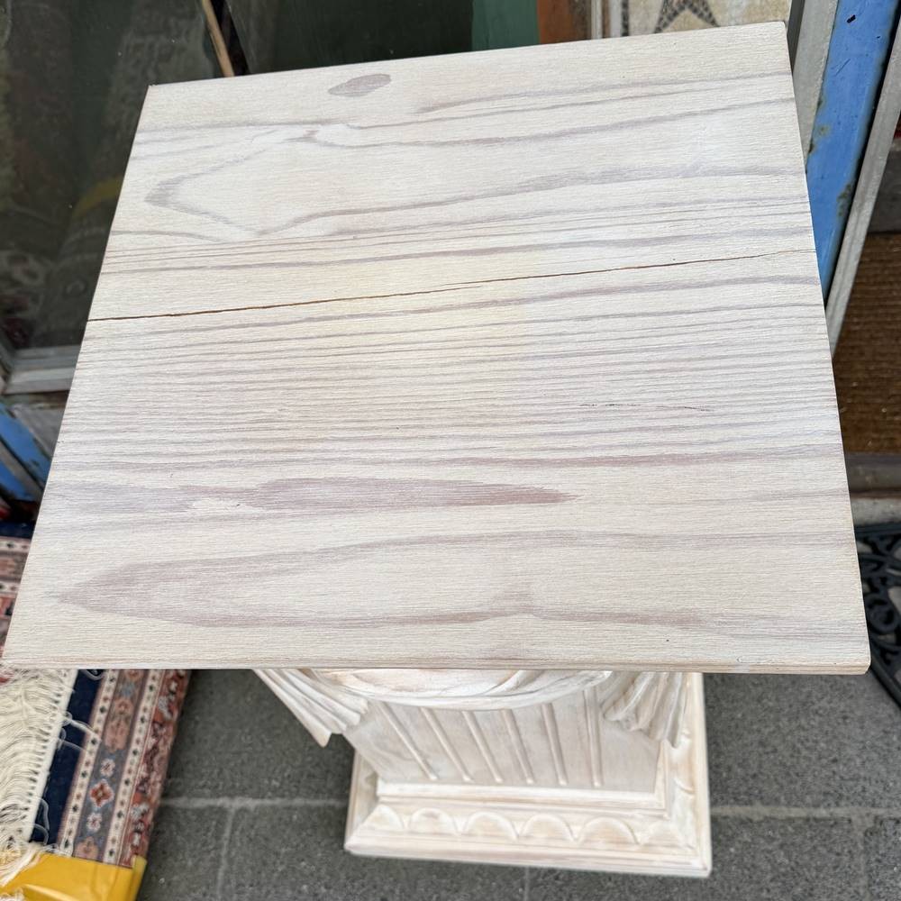 gr. Holz-Podest, verziert, H-72 cm, 42x42 cm, Platte mit Spannungsriss