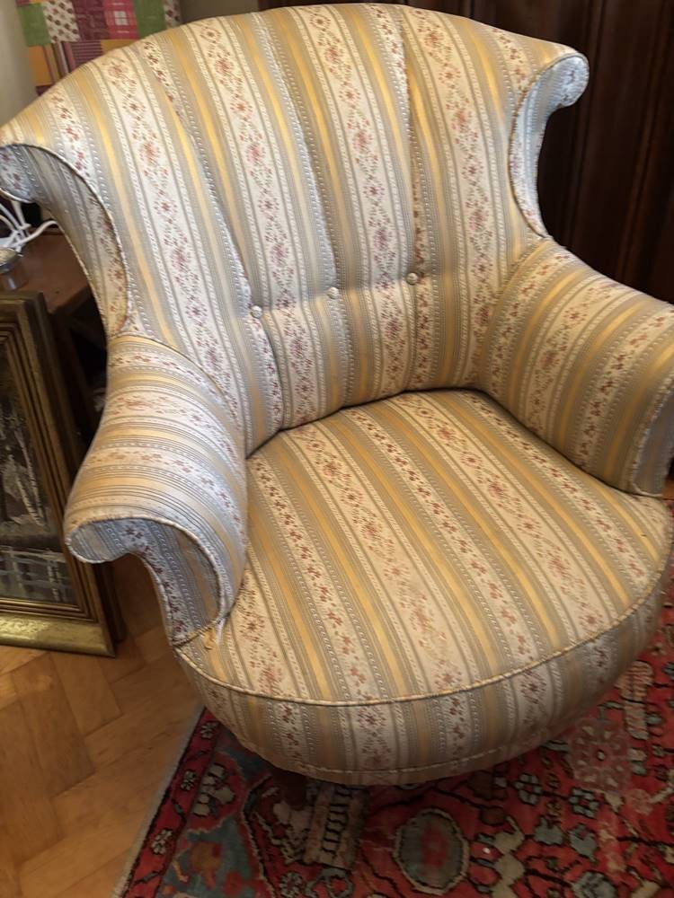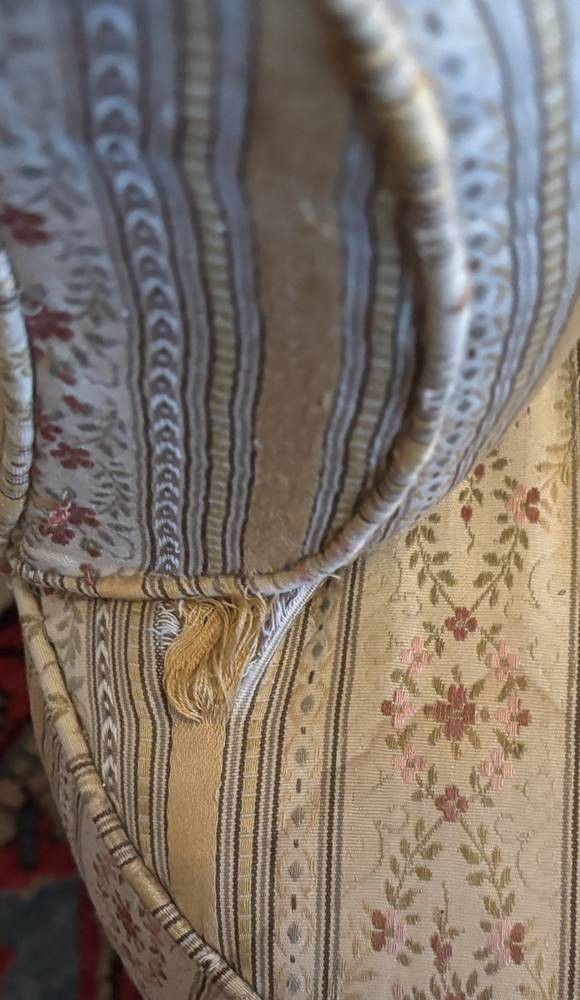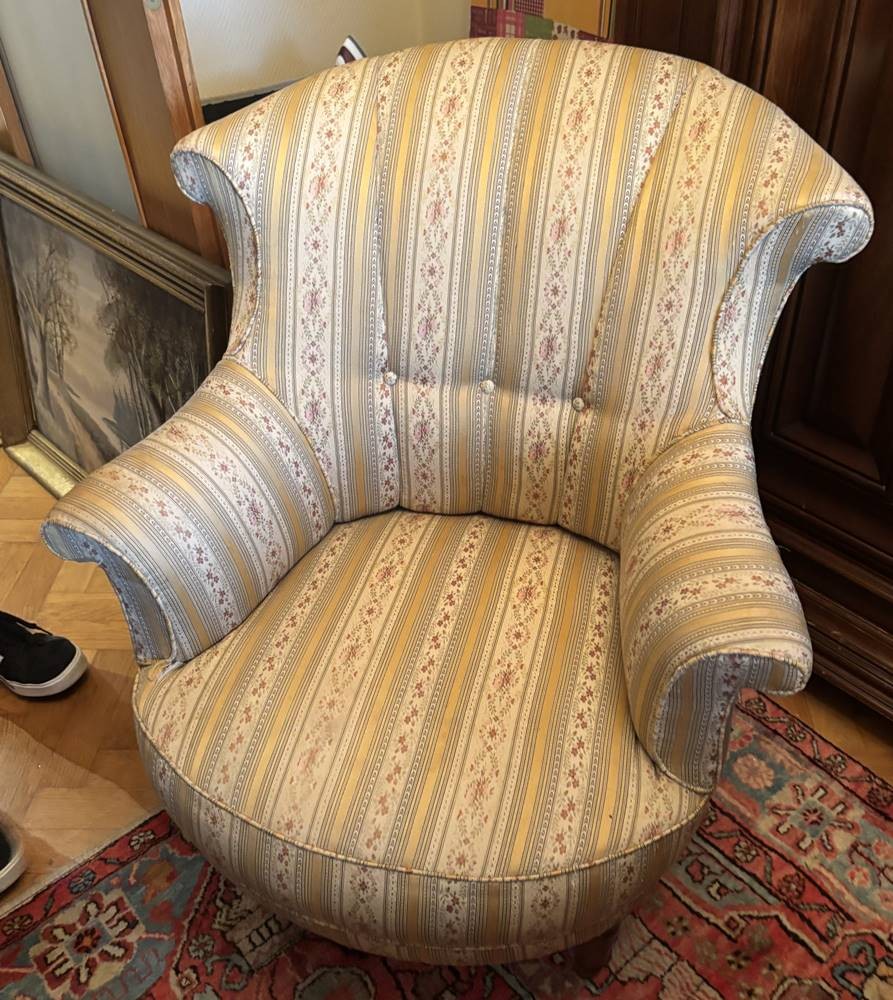 kl. Salonstuhl, gepolstert, unter rechter Armlehne mit kl. Einriss [1]