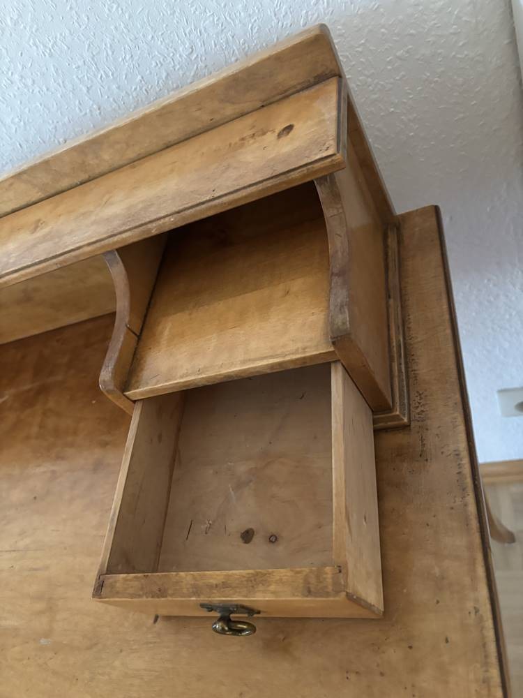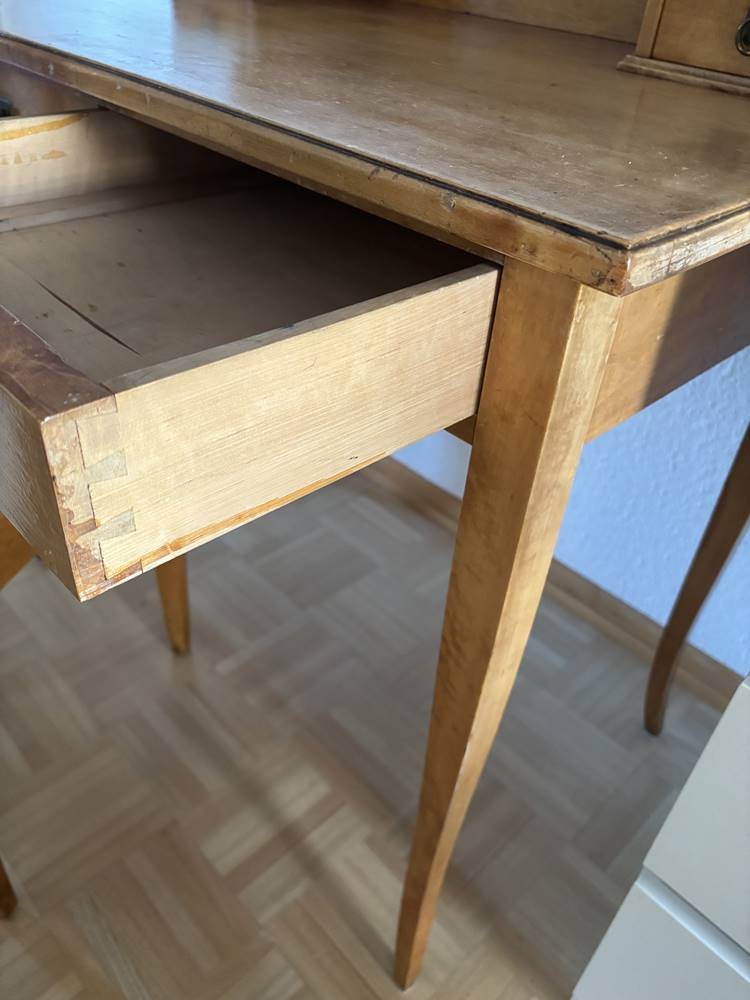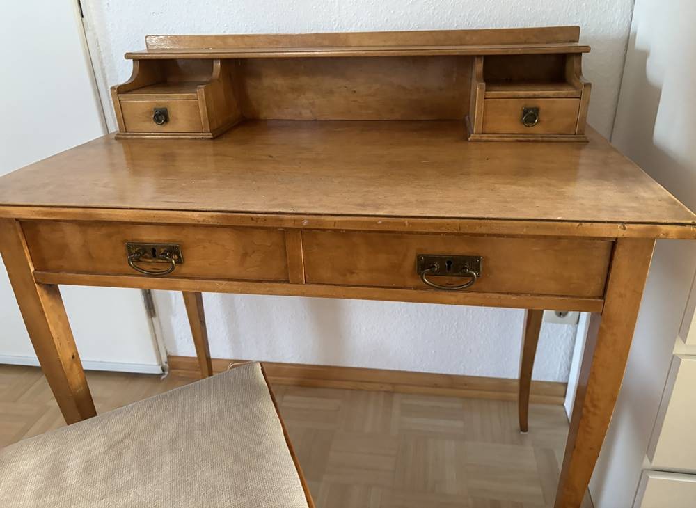 kl. Schreibtisch mit passenden Stuhl, wohl Birke, H-92 cm maximal, 89x54 cm