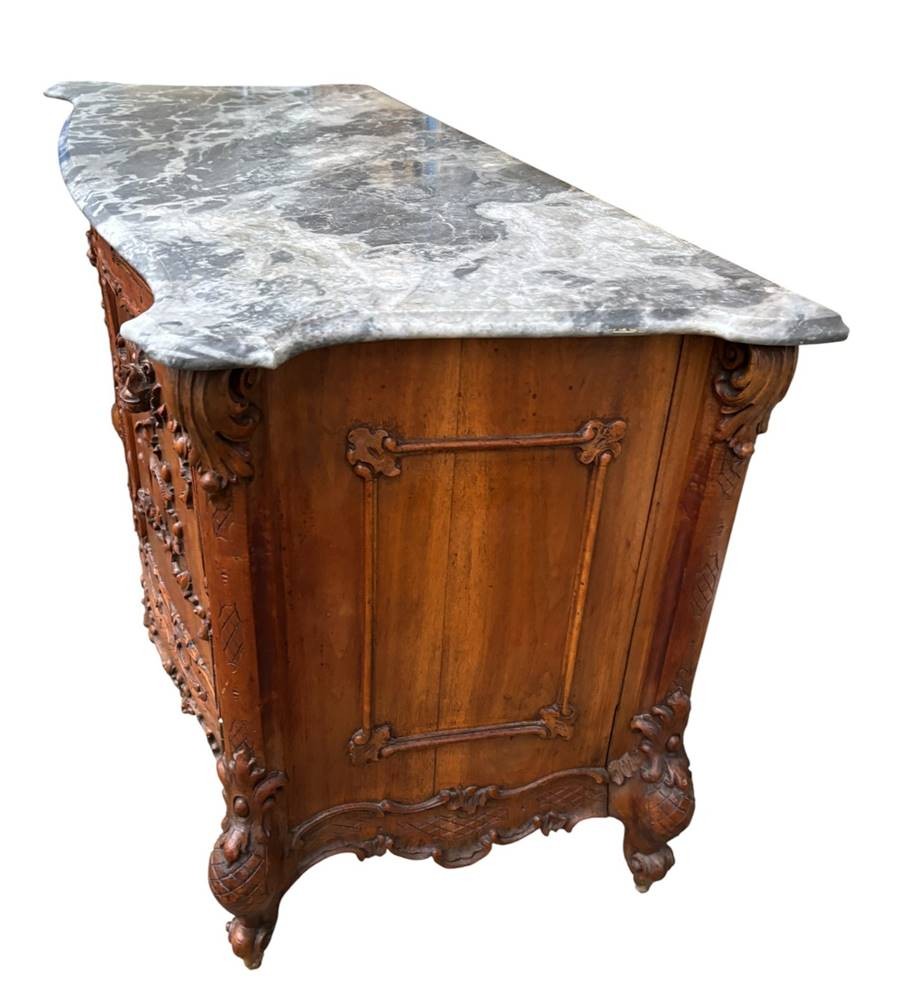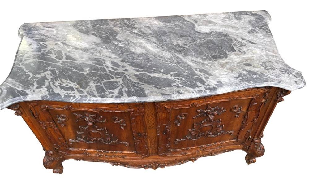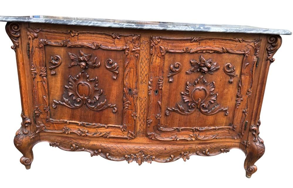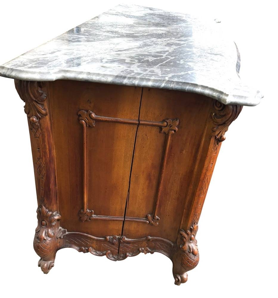 Louis XV Nussbaum Anrichte, Frankreich, wohl Provence, reich verziert, mit gr. geschweifter Marmorplatte, wohl Ende 19.Jhd., kl. Abplatzer etc., H-75 cm, 125x56 cm [1]