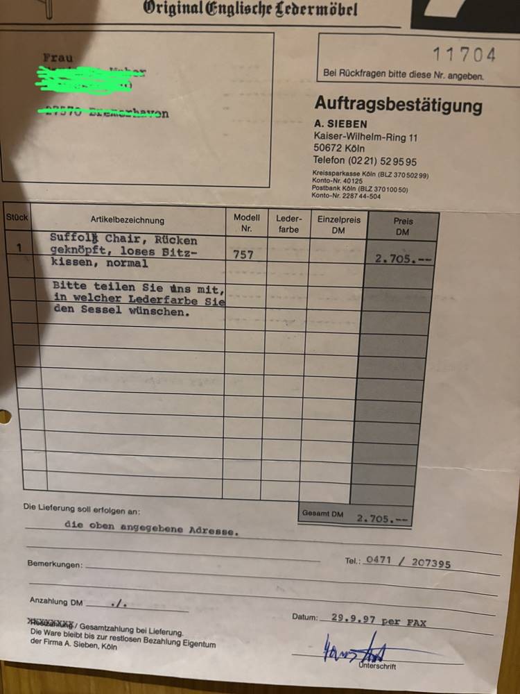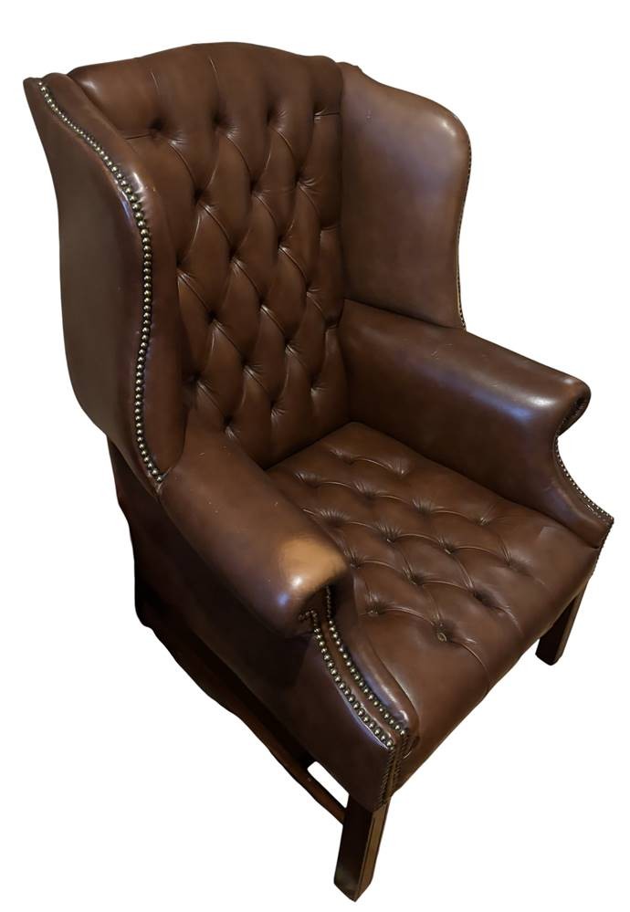 Ohrenbackensessel, orig. Büffelleder, engl. Sessel, mit orig. Rechnung, linke Armlehne mit Kratzspuren, Rechnung anbei [1]
