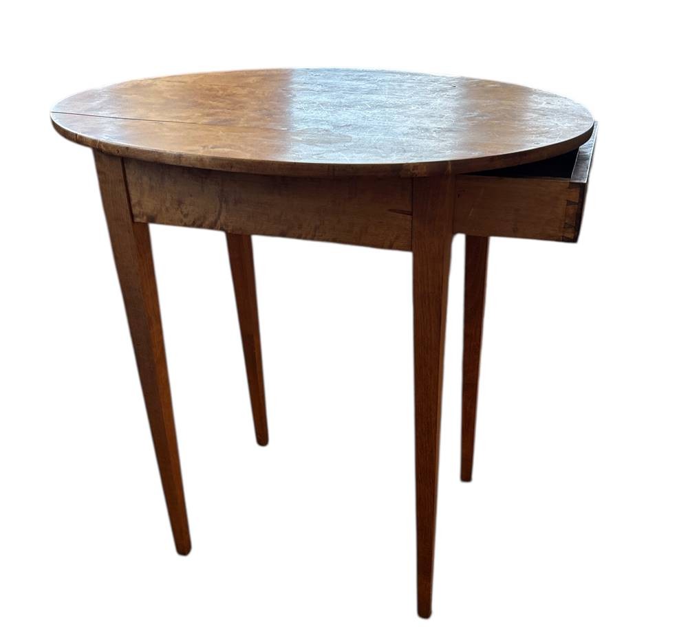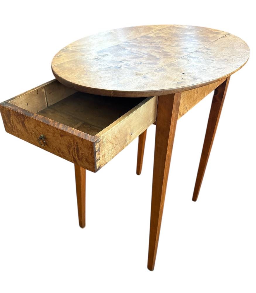 ovaler Beistelltisch mit einer Schublade, gemasertes Walnussholz, um 1840, H-67 cm, 67x46 cm [1]