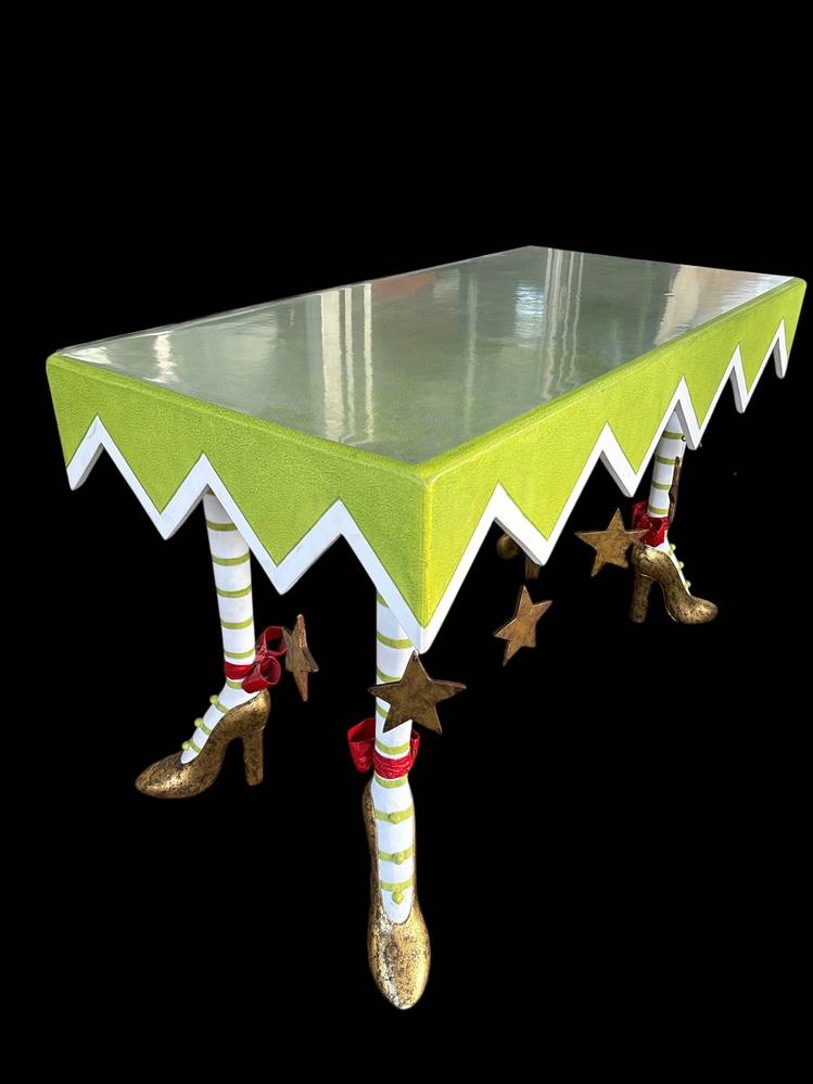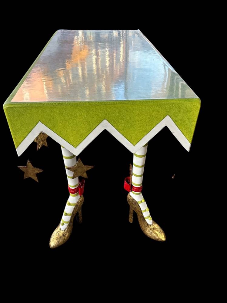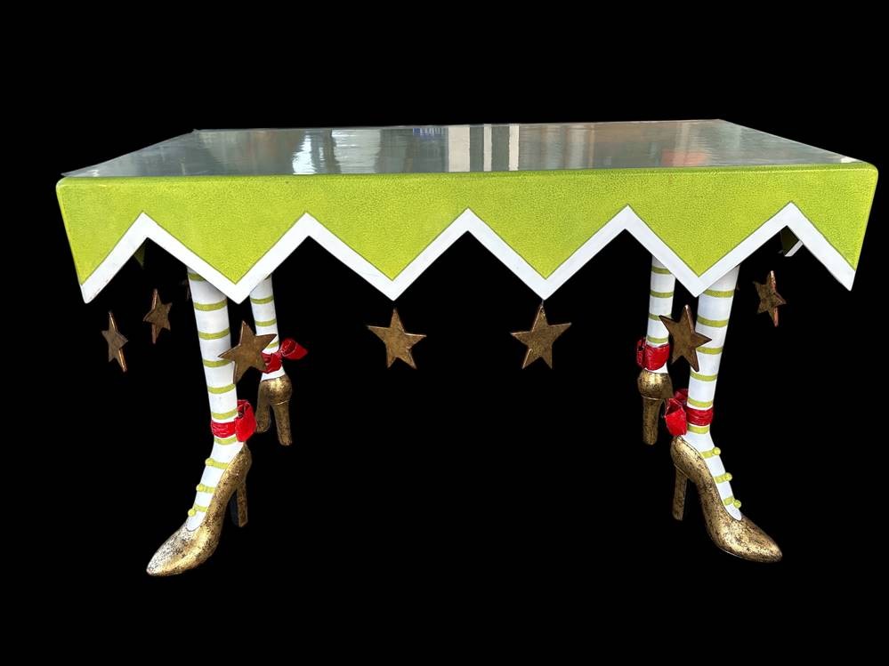 Patience Brewster High Heel Krinkles Tisch., mit Holzplatte, zerlegbar, 120x60 cm, H-76 cm mit umlaufend 16 Hänge-Sterne, gut erhalten [1]
