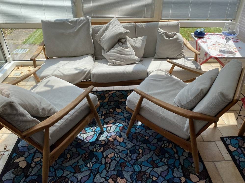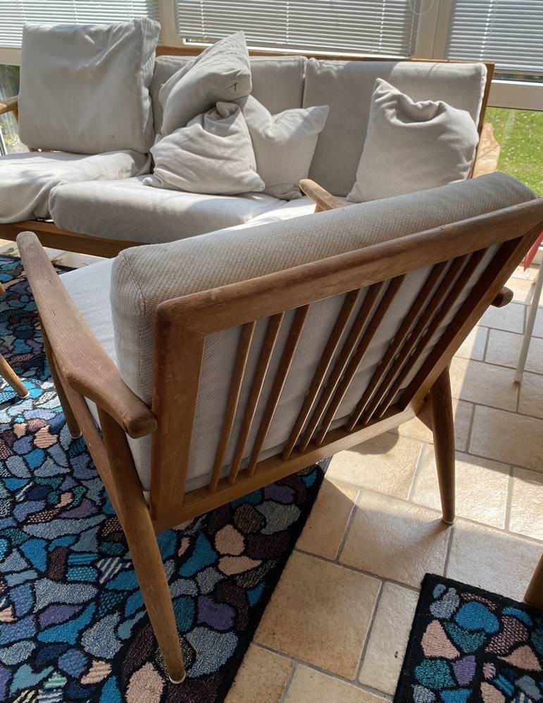 Sitzgarnitur, wohl dänisches Design, Teakholz, Holz und Stoff etwas fleckig, , Dreier und 2 Armlehnstühle [1]