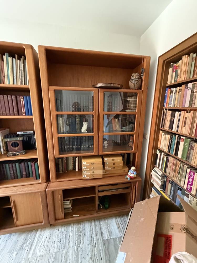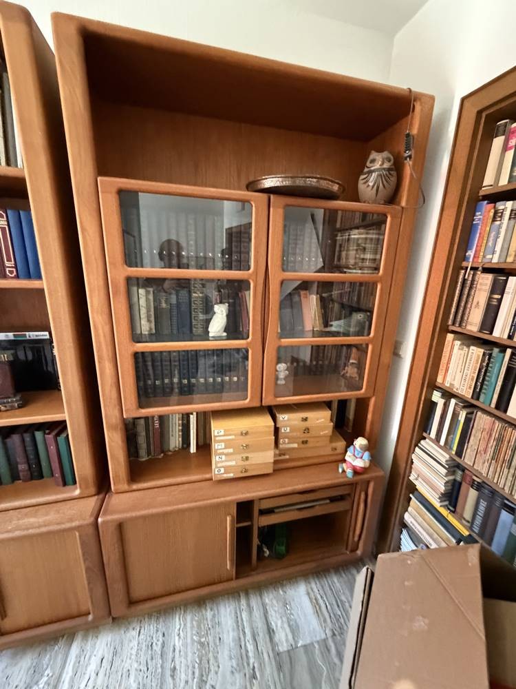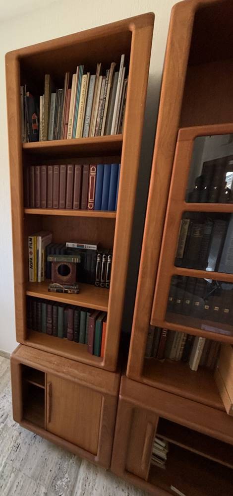Vitrine ûnd kl. Anbauwand, entworfen von Niels Bach für die dänische Qualitätsmarke Dyrlund. Vitrine H-ca. 210 cm, B-120 cm, T-49 cm, massives Holz, ca. 100 kg, gebaut zwischen 1960-69 (ohne Inhalt), leichte Gebrauchsspuren [1]