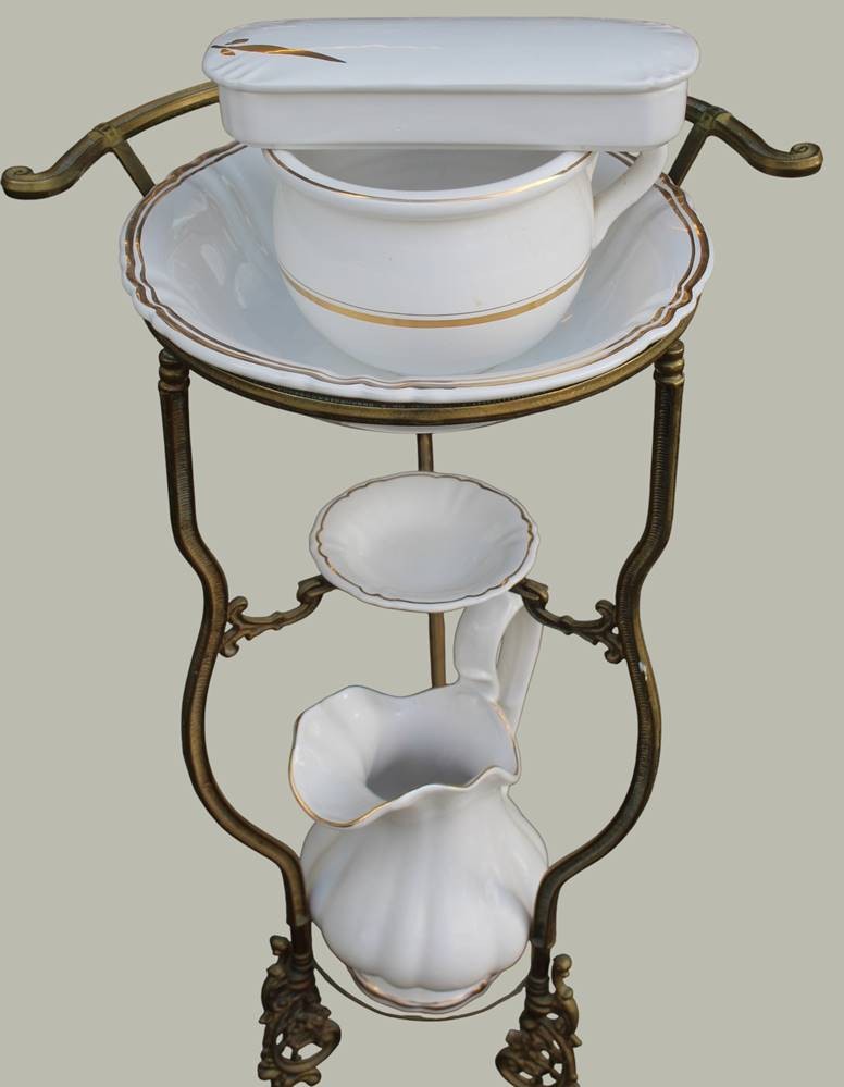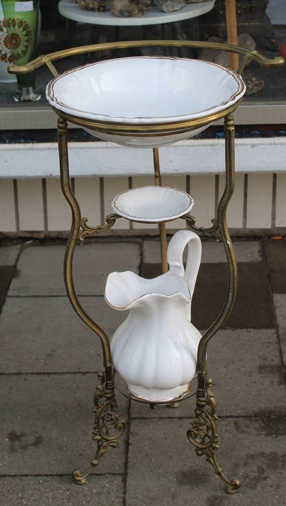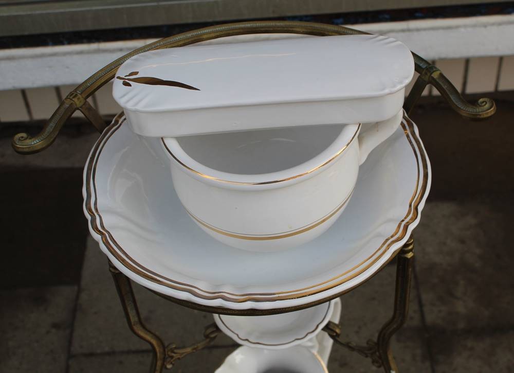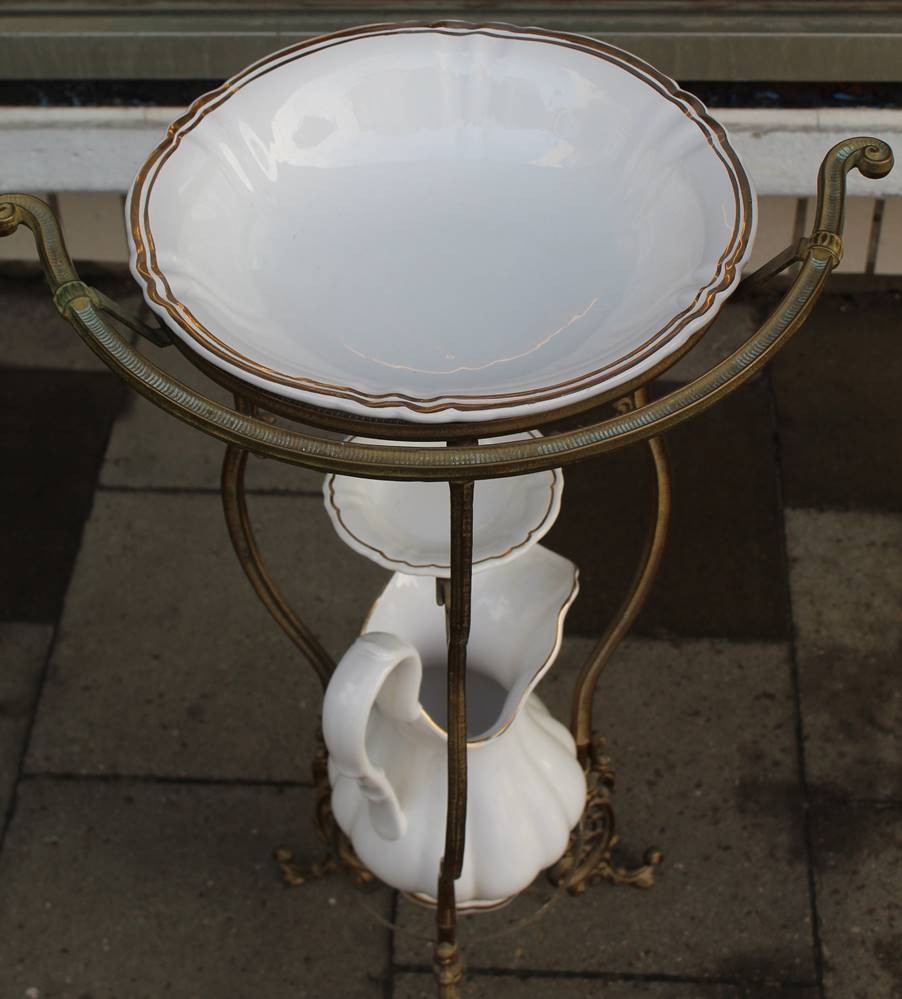 Waschgeschirr in Metallgestell, anbei Nachttopf und gr. Seifenhalter, Dekor ähnlich, neuzeitlich, H-82 cm, B-48 cm [1]