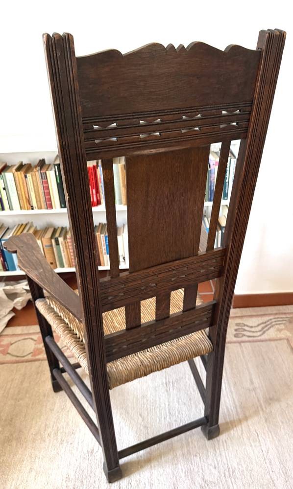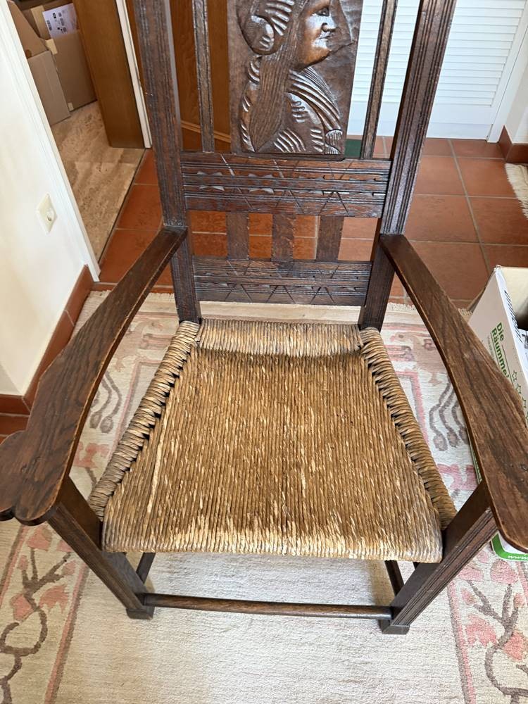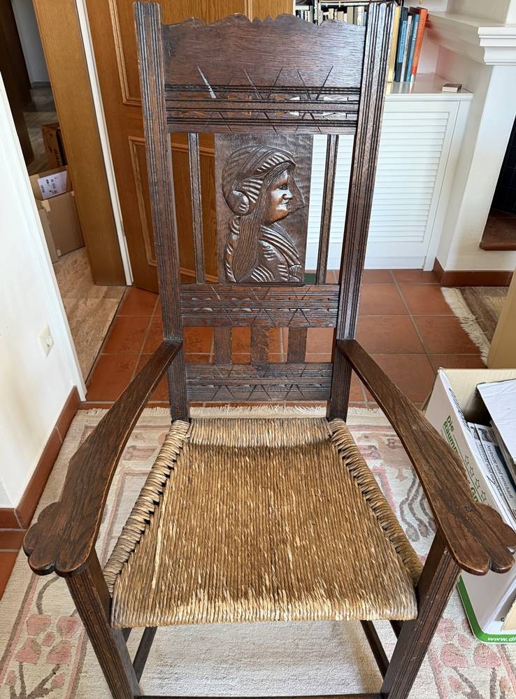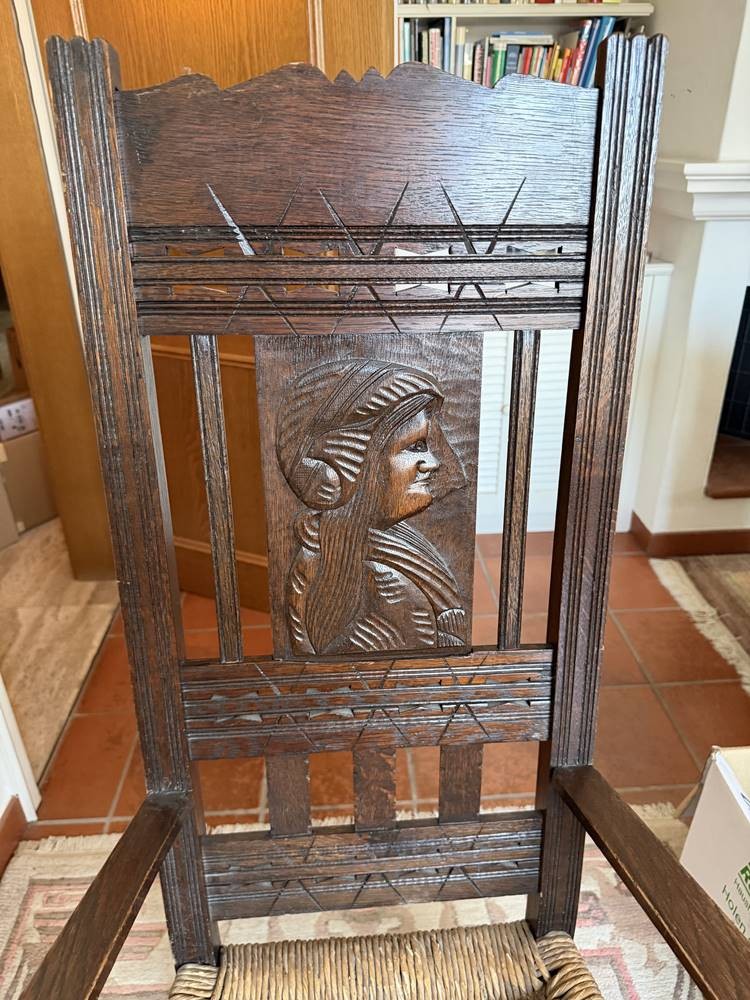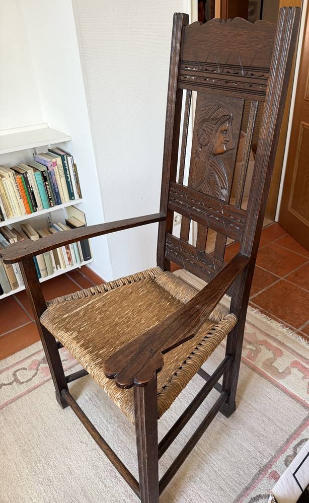 Worpsweder Armlehnstuhl, Lehne mit geschnitzten Frauenkopf, H-127 cm, B-66 cm