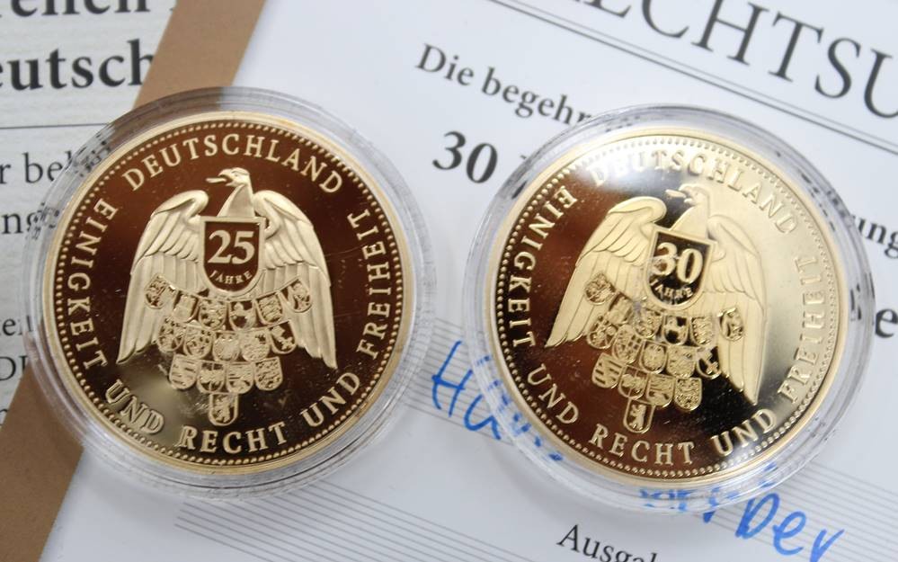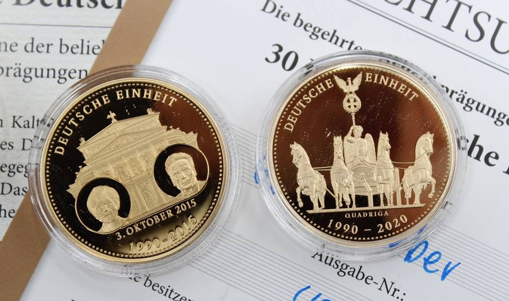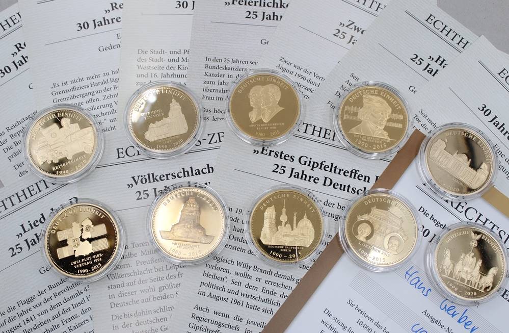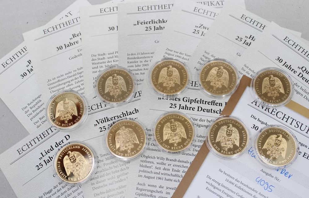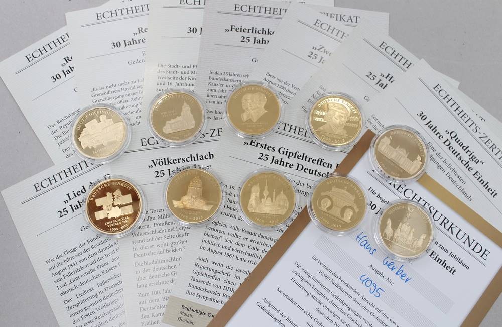 10 x Gedenkprägungen aus Kupfer / vergoldet , 25 & 30 Jahre Deutsche Einheit , polierte Platte - gekapselt mit Zertifikat . [1]