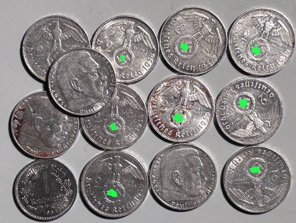 12x 2 Reichsmark und 1x1 Reichsmark, 3.Reich, Hindenburg