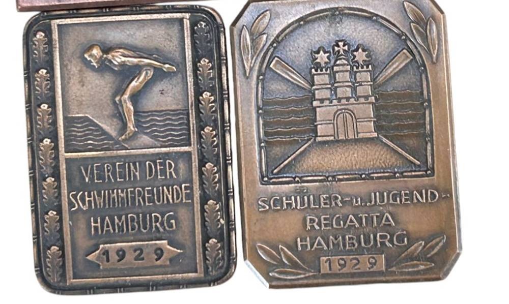 2 kl. Bronze-Plaketten, Sportveranstaltungen in Hamburg 1929, je 4x3 cm