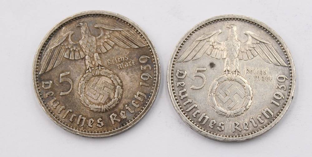 2x 5 Reichsmark Münzen - Paul von Hindenburg - Hoheitszeichen, Silber, 900er Silber, 27,8 Gramm [1]