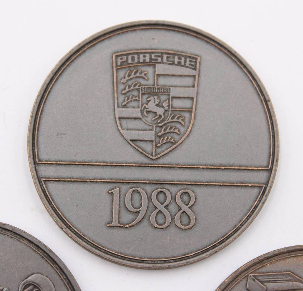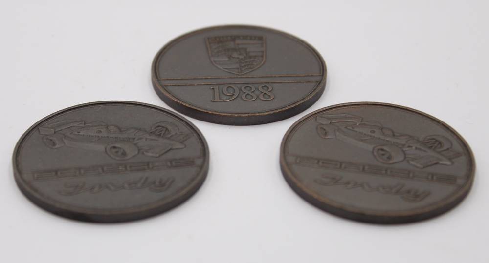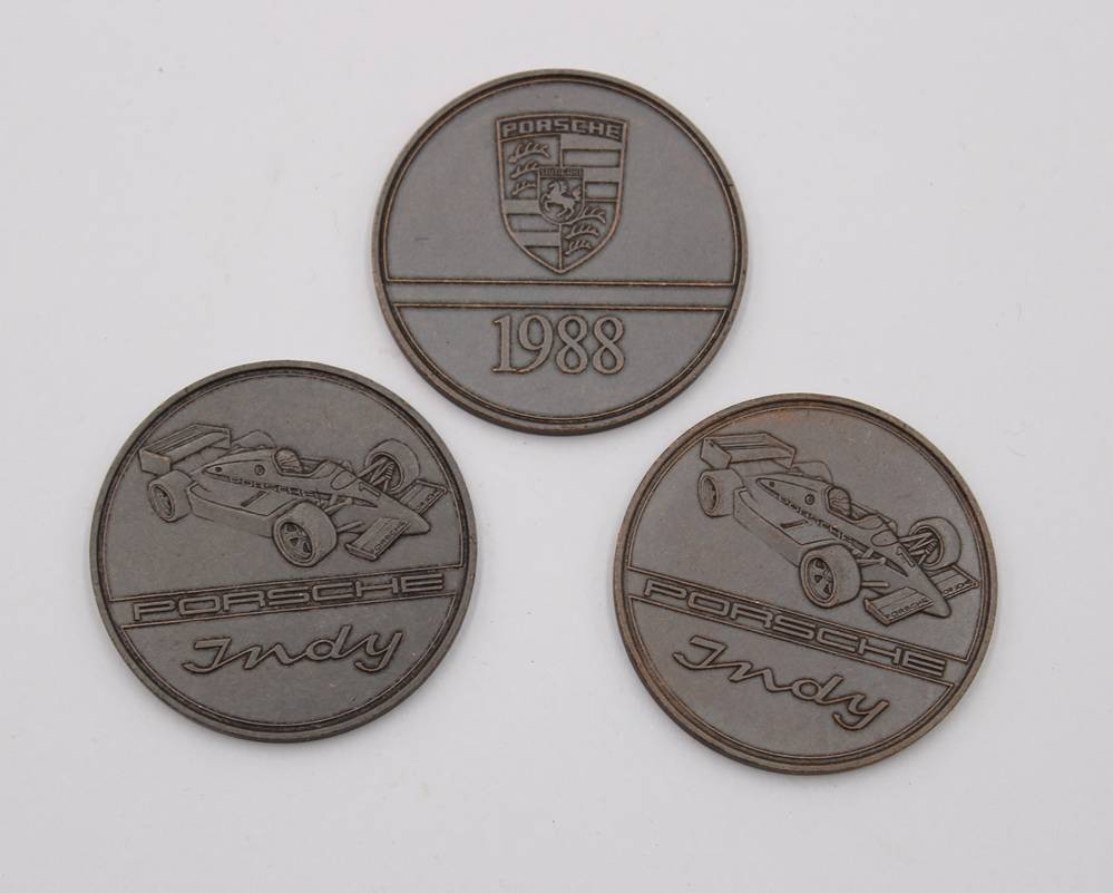 3x Porsche Indy - Medaillen aus dem Jahr 1988, Bronze, ca. D-3,8cm