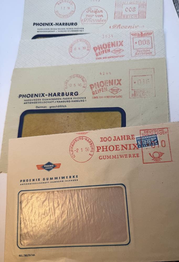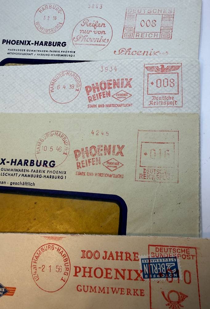 4 Werbe-Postkarten und 4 Briefumschläge, Gummiwerke Harburg-Wien, später Phoenix AG
