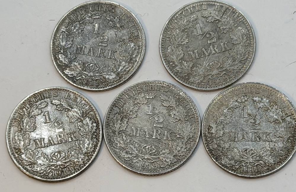 5x 1/2 Mark, Deutsches Reich 1918+1919, Silber