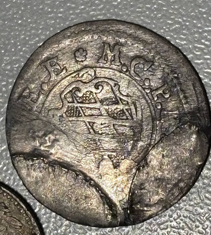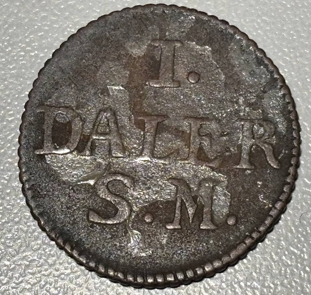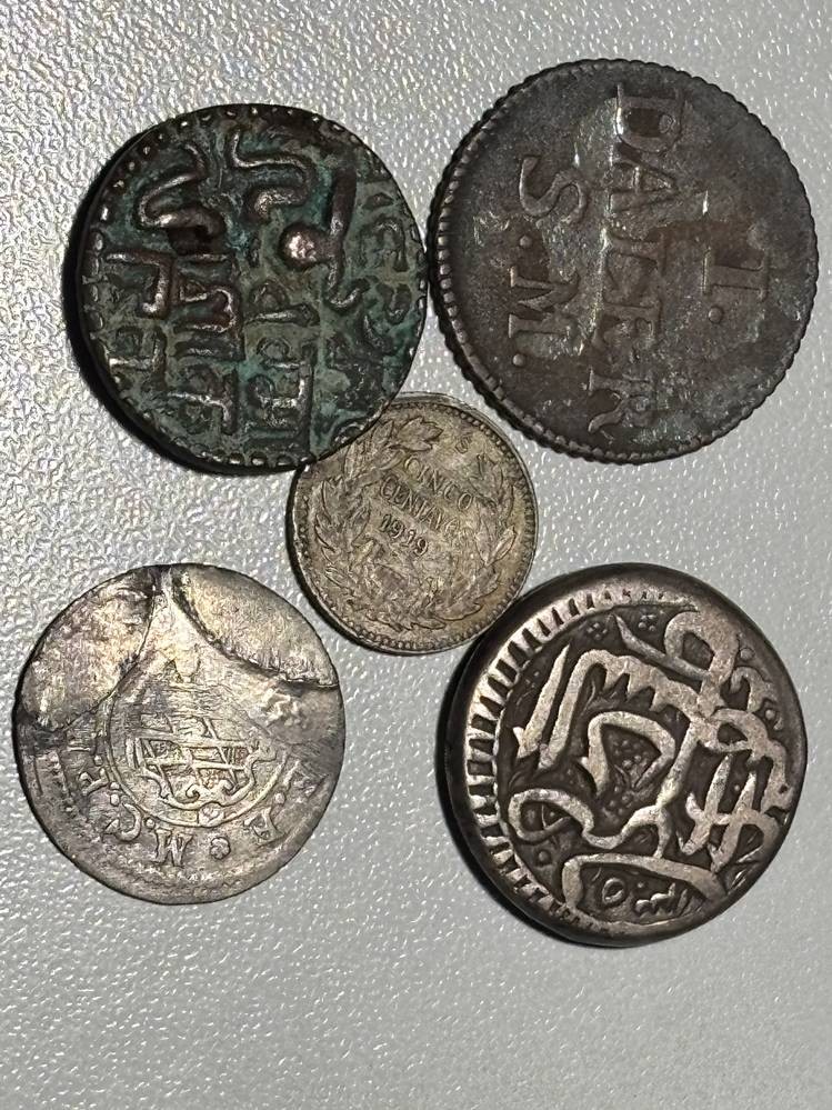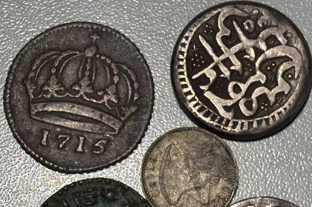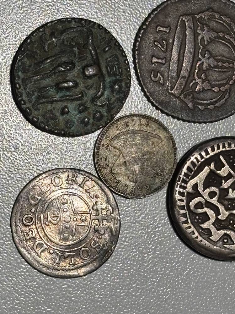 5x alte Münzen, 1x davon wohl Silber??, jüngste 5 Centavos, 1919, Chile, älteste 1 Daler, 1715, Schweden, sowie 2 arabische unbekannte Münzen? [1]