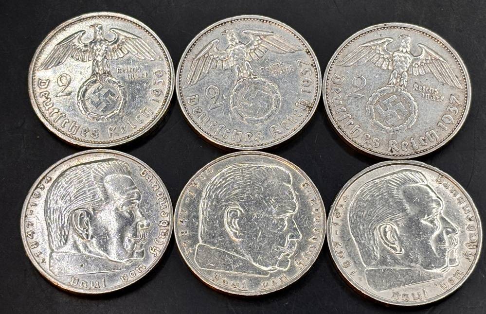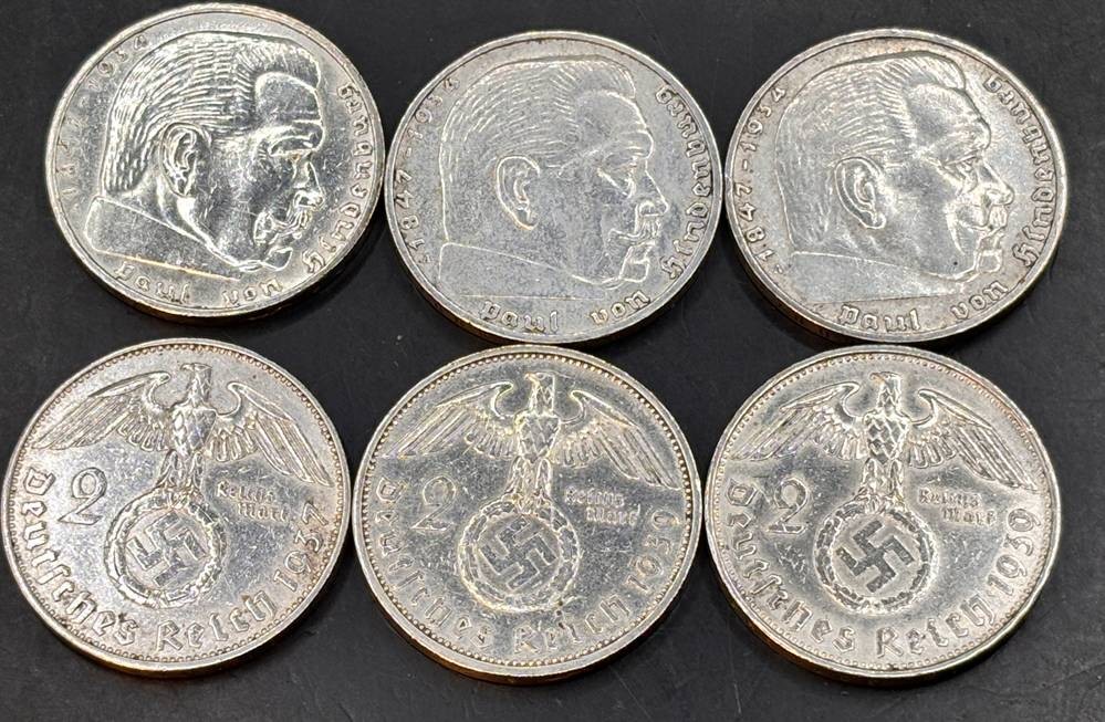 6x 2 Reichsmark, Hindenburg, 30-er Jahre, Silber