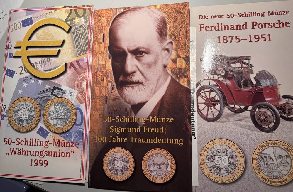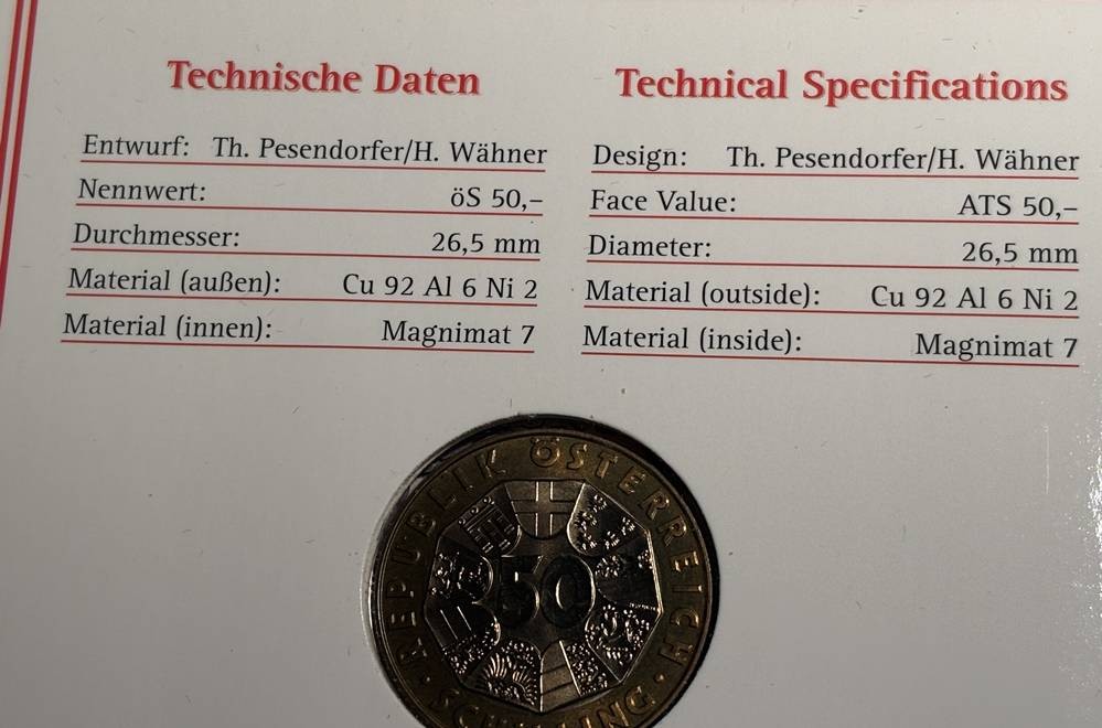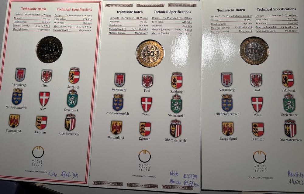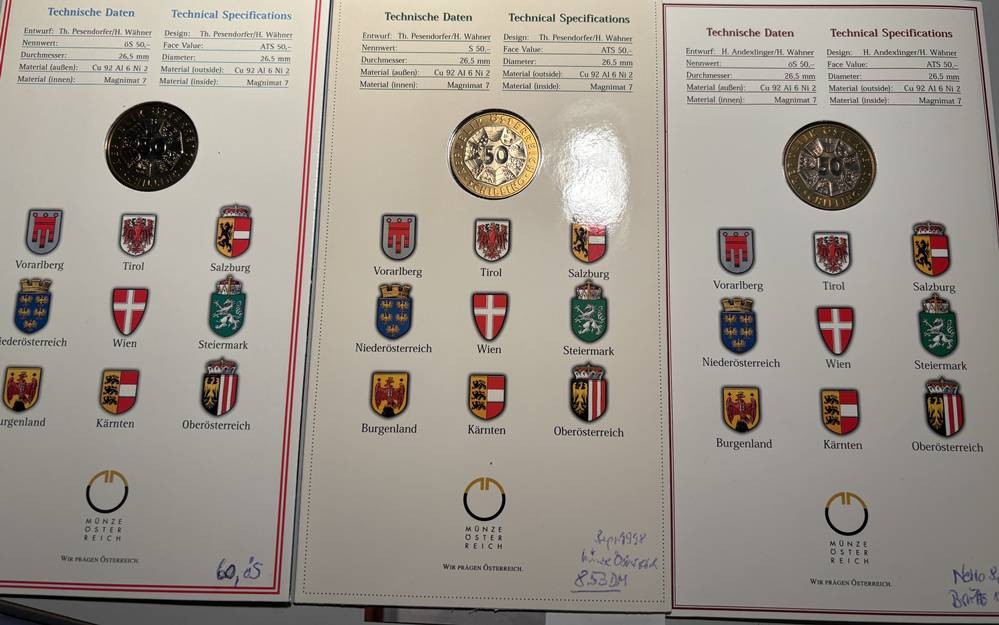 6x 50 Schilling Münzen, alle in orig. Blister, Bimetall, 90-er Jahre [1]