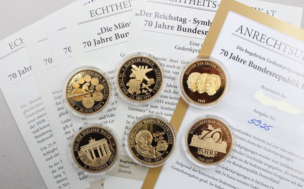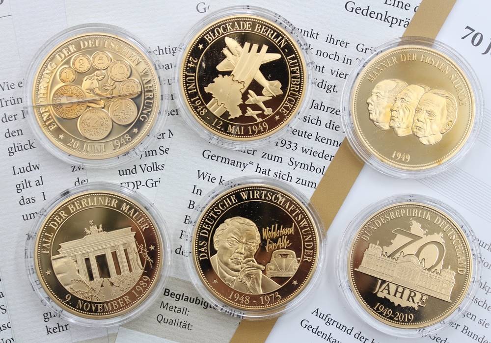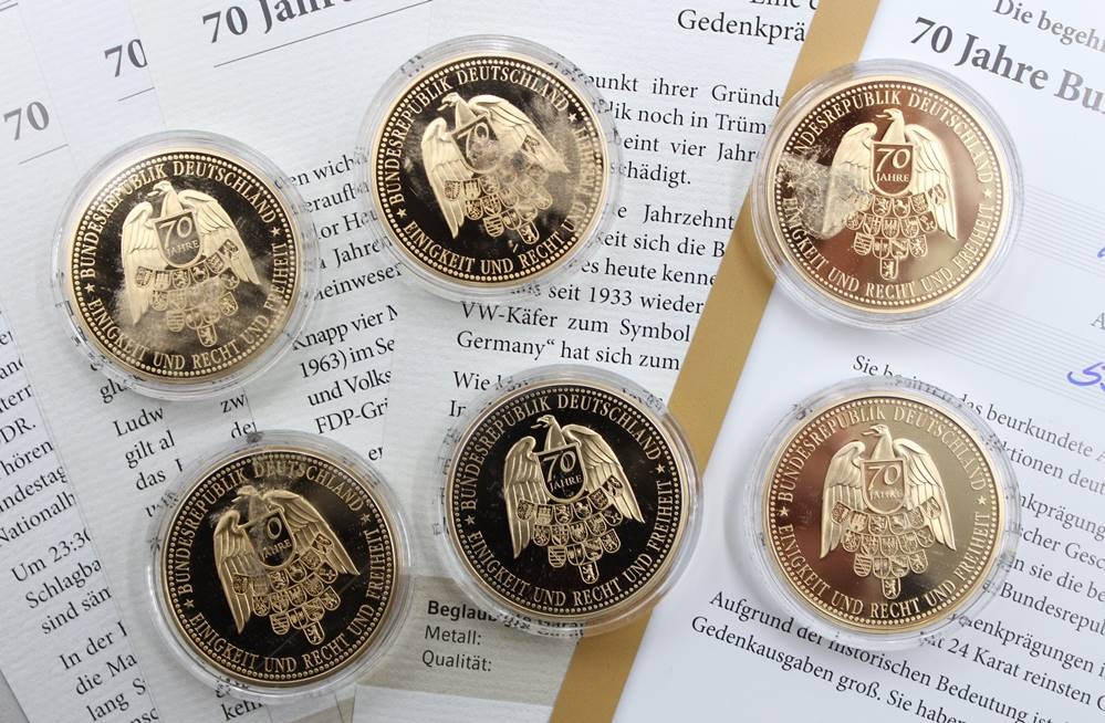 6x Gedenkprägungen ,, 70 Jahre Bundesrepublik Deutschland '' Kupfer / vergoldet , polierte Platte ,gekapselt mit Zertifikat . [1]