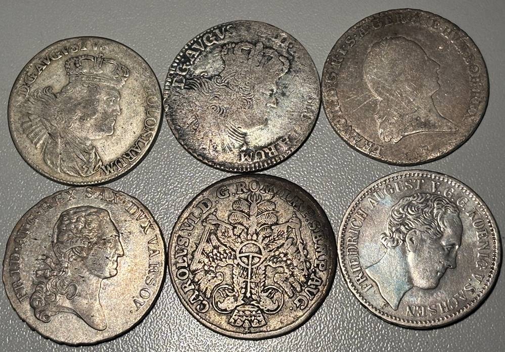 7 alte Silbermünzen, 1x Peru, wohl 5x Sachsen, ab ca. 1790 und 1x Hamburger Current Geldt 1727,