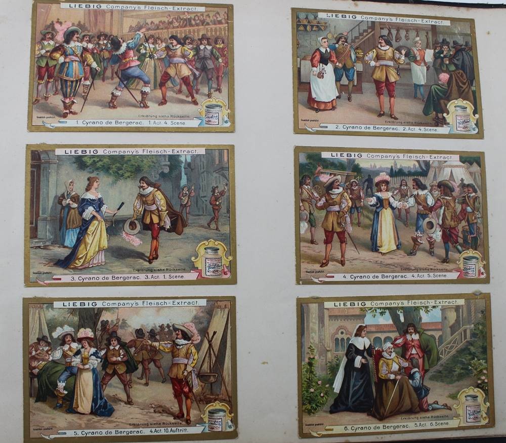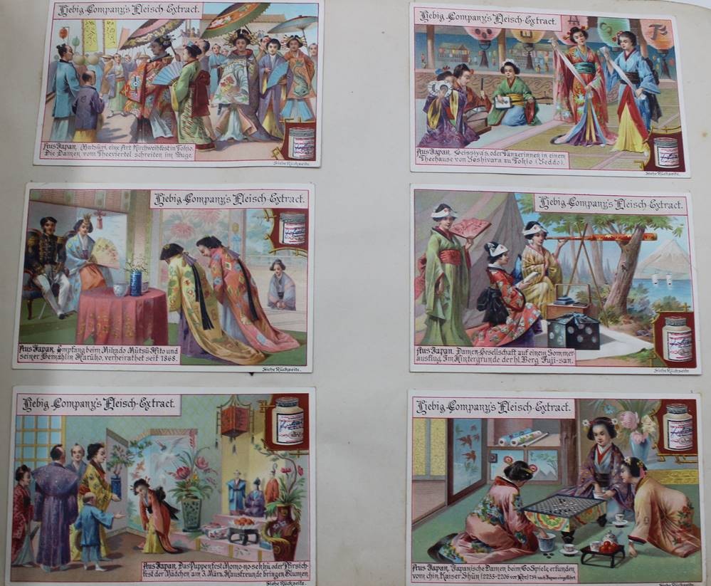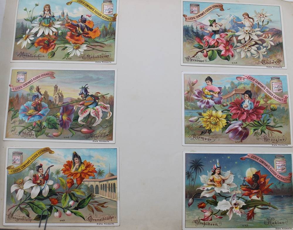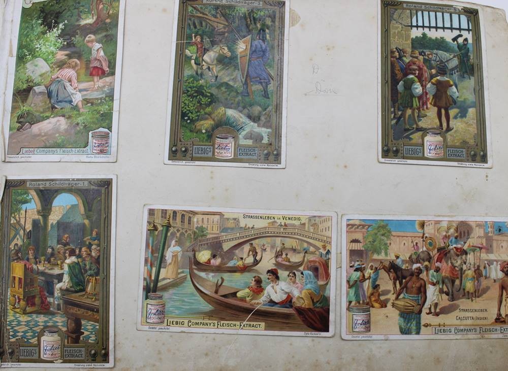 altes Album mit eingeklebten Liebig-Sammelbildern, versch. Serien, Alters-u. Gebrauchsspuren [1]