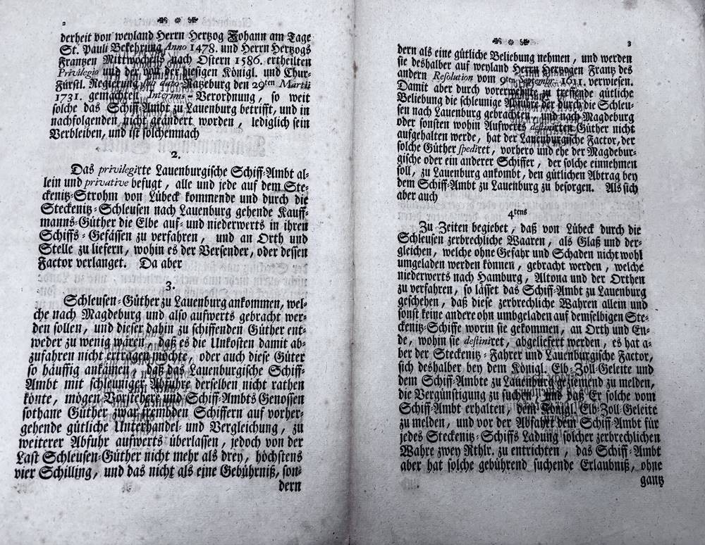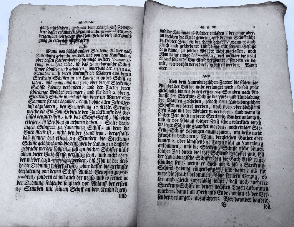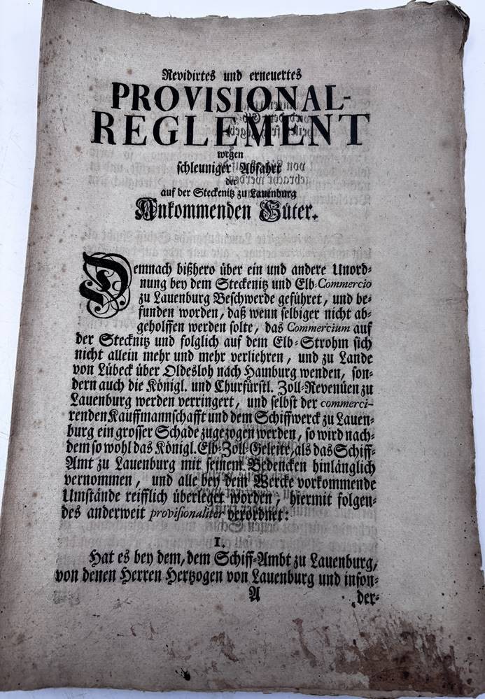 Das Dokument ist ein revidiertes und erneuertes provisorisches Reglement für ankommende Güter auf der Stecknitz bei Lauenburg. Es befasst sich mit Unordnungen im Stecknitz- und Elbhandel, die drohen, das Commercium zu verringern und die königlich-churfürstlichen Zolleinnahmen sowie die Kauffmannschaft zu schädigen. Das Reglement wurde nach Beratung mit dem königlichen Elb-Zoll-Geleit und dem Schiff-Amt zu Lauenburg erlassen. [1]