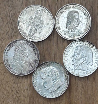 die ersten 5 DM Gedenkmünzen der BRD, Germanisches Museum, Fichte, von Eichendorff, von Schiller, Markgraf von Baden, ab 1952 [1]