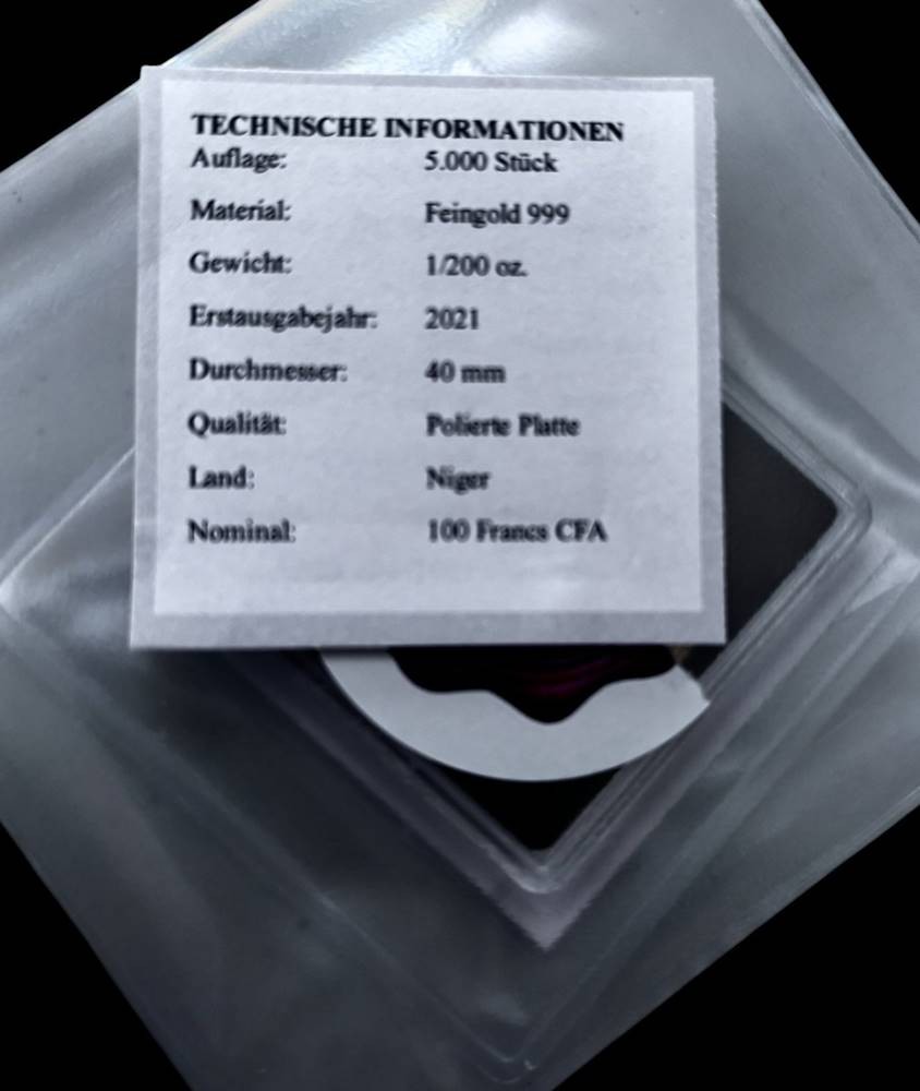 Goldmedaille -999- 100 Franc CFA, Niger, 2021, 1/200 Unze, mit Zertifikat [1]