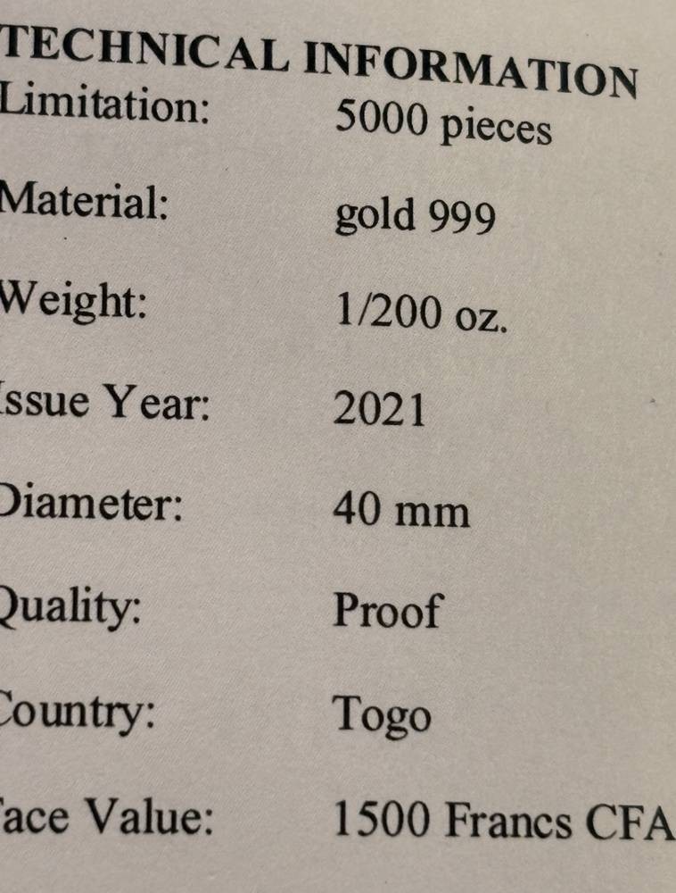 Goldmünze-999- Mona Lisa, Togo, 1500 CFA, 2021 [1]