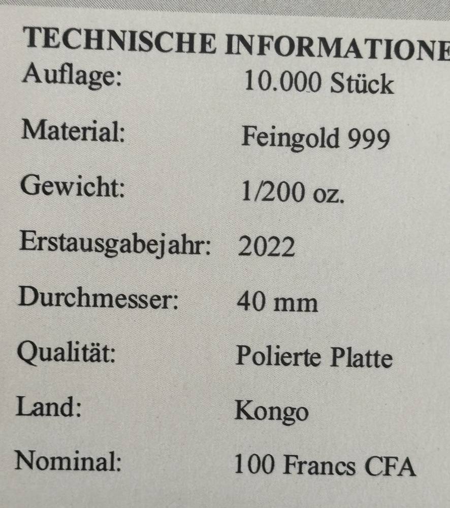 Goldmünze Kongo 100CFA, 2022, Diana-a Princess, mit Zertifikat, -999-, 1/200 Unze, D-40 mm [1]