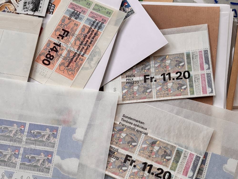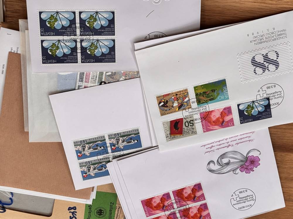 gr. Lot Briefmarken, hpts. Schweiz, 4x PTT Alben orig. voll, sowie viele Ersttagsbriefe, Sonderstempel etc., tw. voll mit Marken, Grossteil Schweiz postfrisch