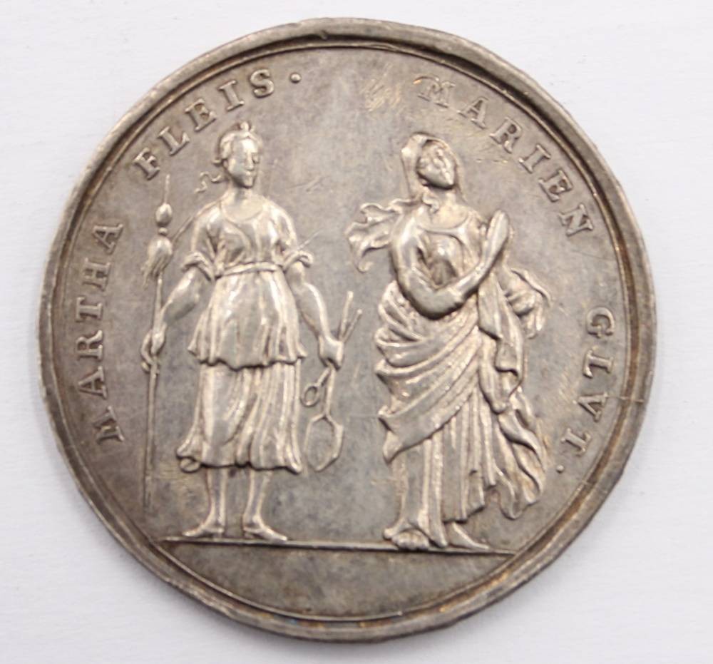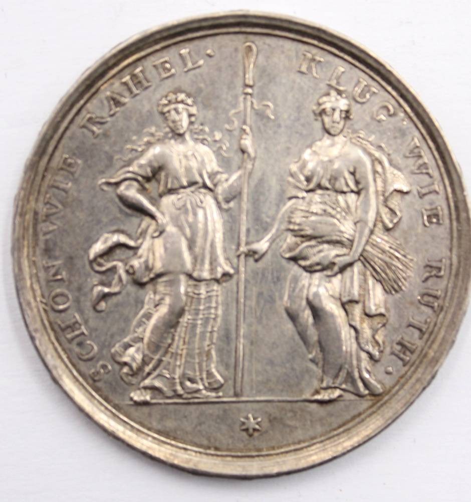 Hochzeitsmedaille, Leipzig um 1700, Silbermedaille o.J. (P. H. Müller) Rahel mit Schäferstab und Ruth mit Ährenbüschel, SCHÖN WIE RAHEL. - KLUG WIE RUTH / Martha mit Spinnrocken und Kochgeschirr und betende Maria, MARTHA FLEIS. - MARIEN GLVT. Erhabene Randschrift: * FRAVEN= ZIMMER HEVRATGVTT. 37 mm, 14,85 g