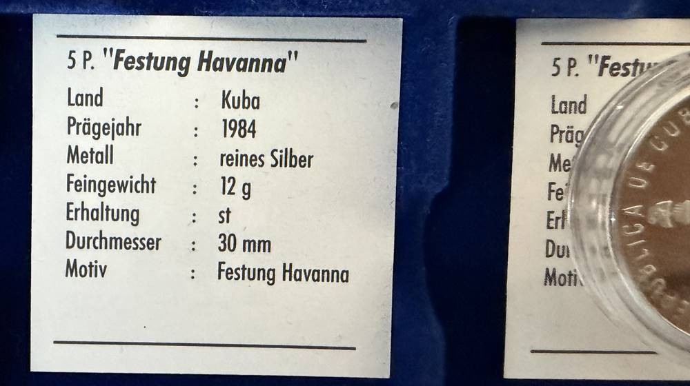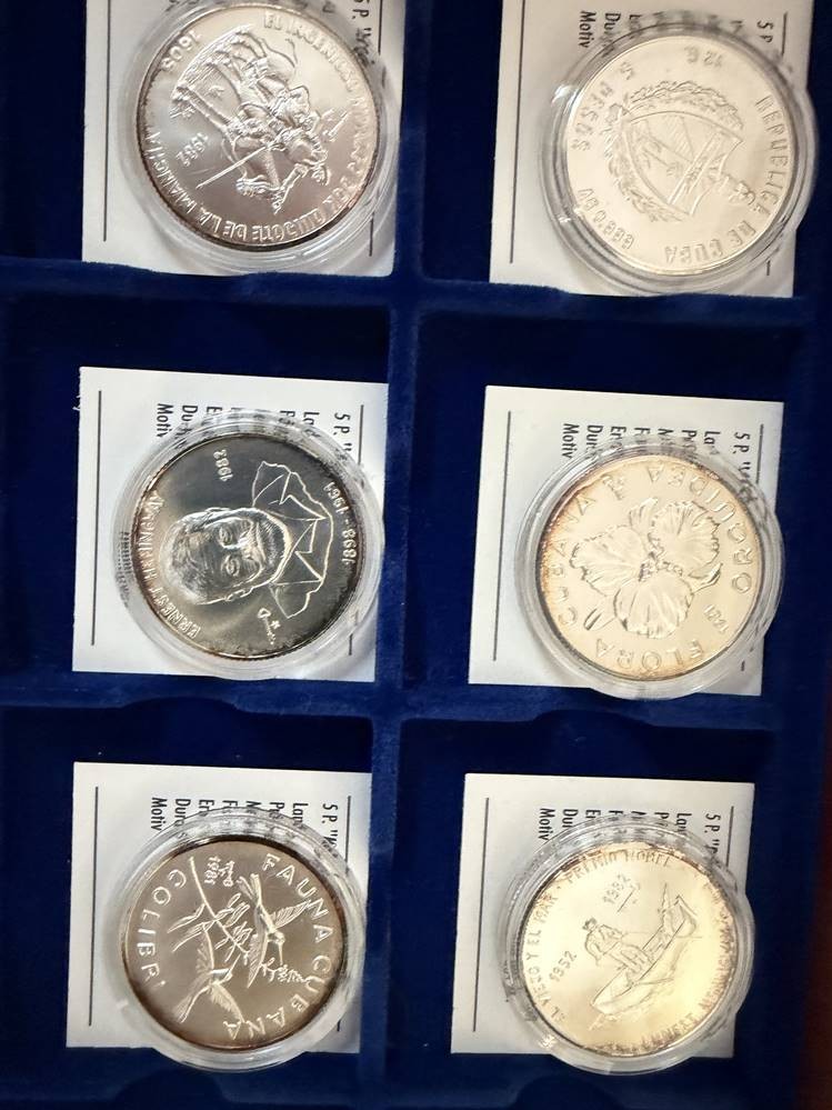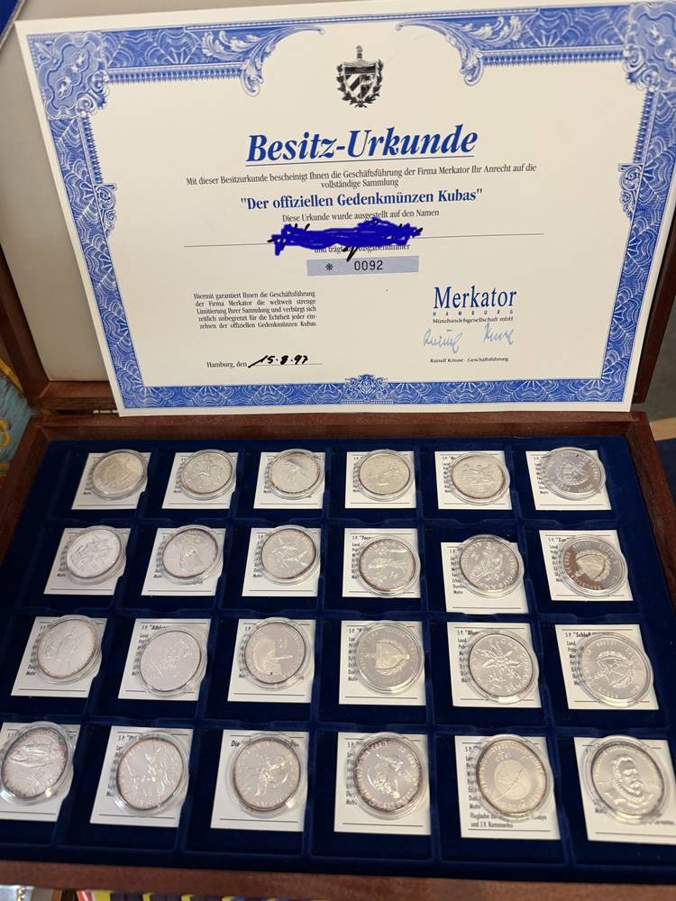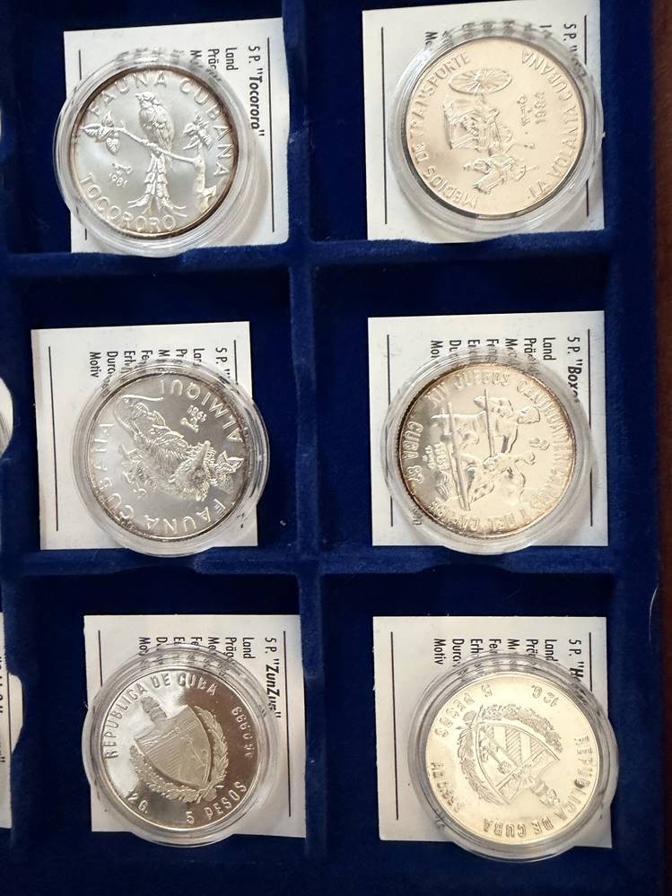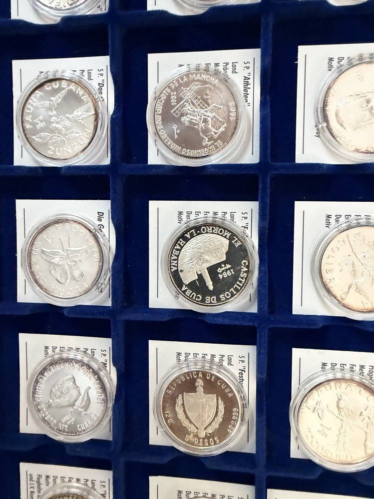 Kasten mit 24 Feinsilber-Münzen (-999-), alle 5 Pesos Gedenkmünzen Kuba, mit Zertifikaten, limitierte Auflage, je 12 gr. (zus. 288 gramm), Stempelglanz [1]
