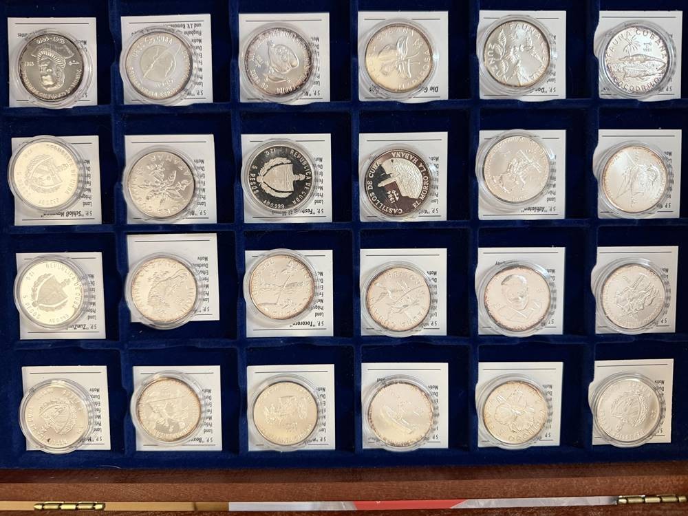 Kasten mit 24 Feinsilber-Münzen (-999-), alle 5 Pesos Gedenkmünzen Kuba, mit Zertifikaten, limitierte Auflage, je 12 gr. (zus. 288 gramm), Stempelglanz