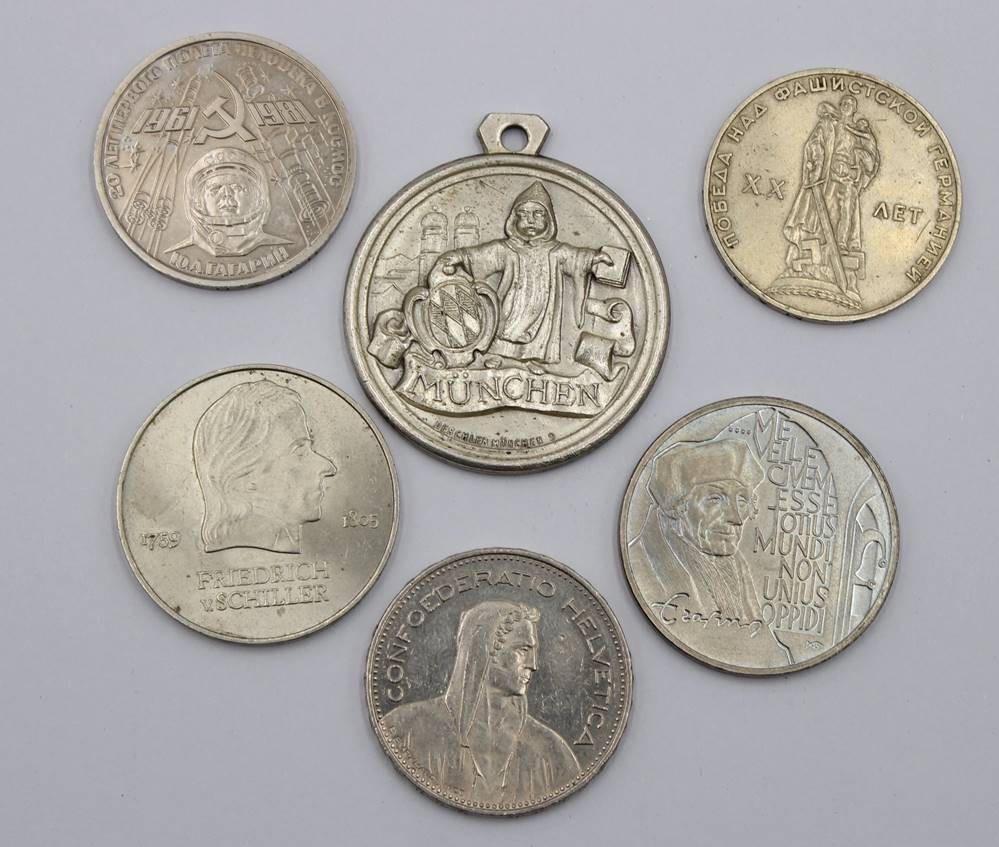 kl. Konvolut div. Münzen und eine Medaille, 2x Rubel, DDR Mark, Franken und Ecu