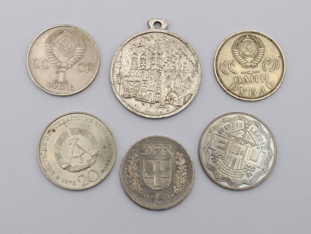kl. Konvolut div. Münzen und eine Medaille, 2x Rubel, DDR Mark, Franken und Ecu [1]