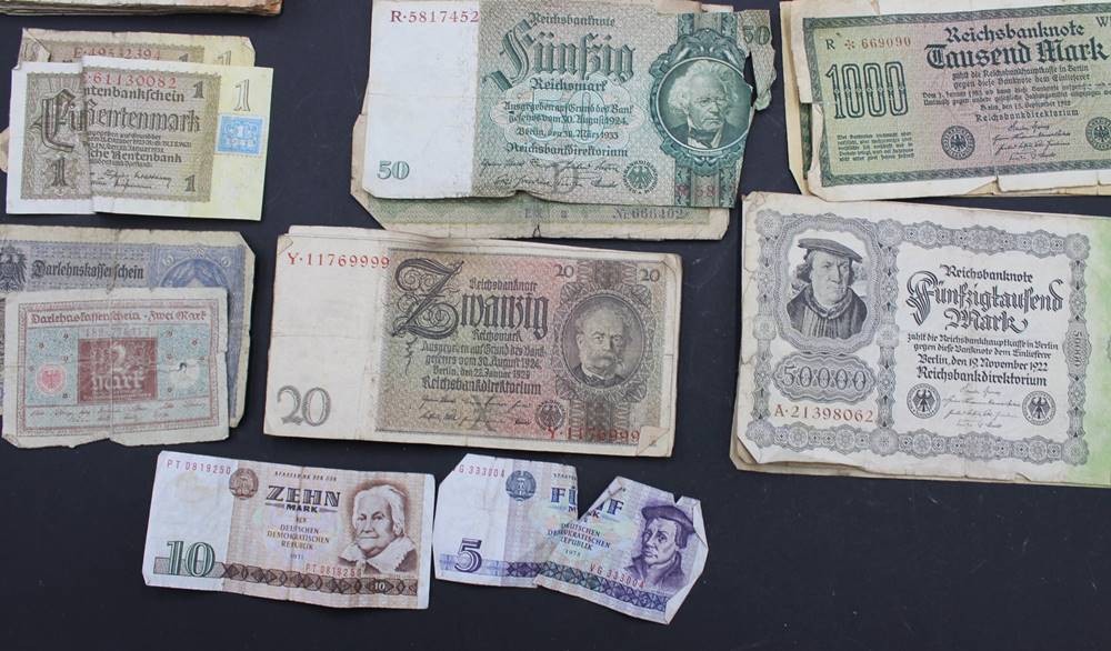 Konvolut div. Banknoten, teilw. DR, Inflation etc., Alters-u. Gebrauchsspuren