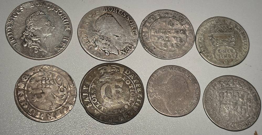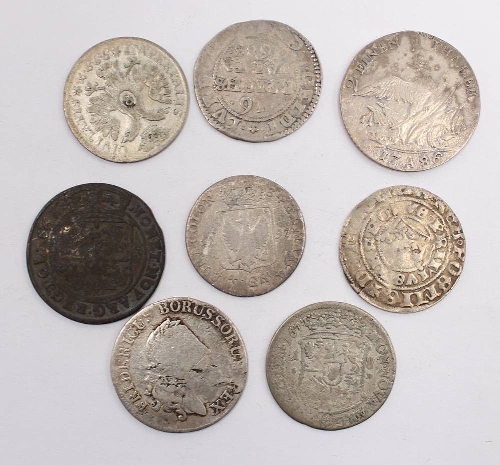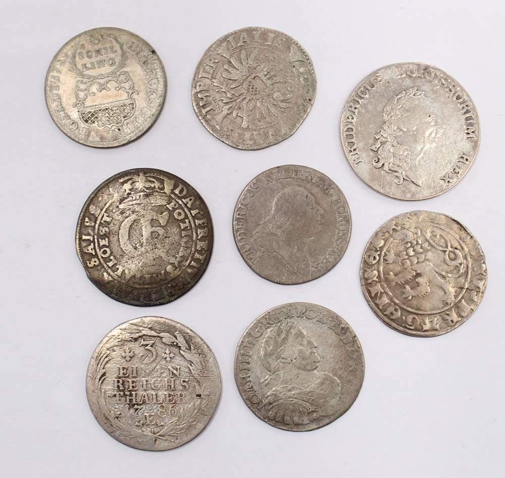 Lot antiker Silbermünzen, u. a. 4 Groschen Preussen 1797, 3 einen Reichsthaler 1783 E, 2 einen Reichsthaler 1786 A, (mit neuzeitlichen Silberstempel?) 16 Reichsthaler 1623, 8 Schilling Lübeck 1729, Joan III, 1677 ?, etc., 8 Stück, unterschiedliche Erhaltung