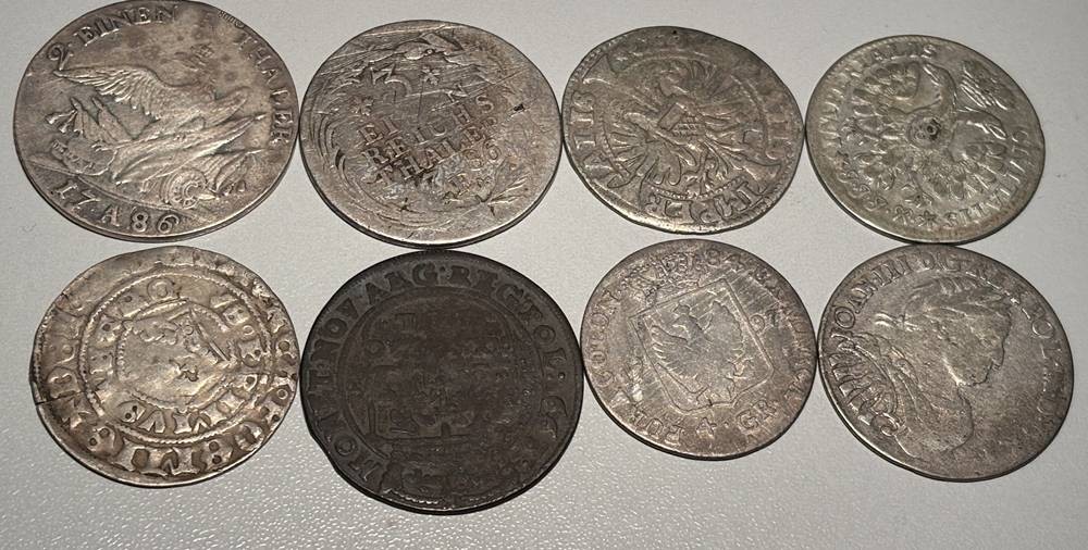 Lot antiker Silbermünzen, u. a. 4 Groschen Preussen 1797, 3 einen Reichsthaler 1783 E, 2 einen Reichsthaler 1786 A, (mit neuzeitlichen Silberstempel?) 16 Reichsthaler 1623, 8 Schilling Lübeck 1729, Joan III, 1677 ?, etc., 8 Stück, unterschiedliche Erhaltung [1]