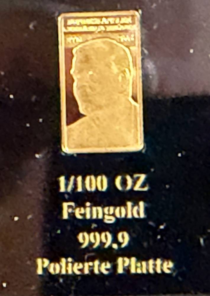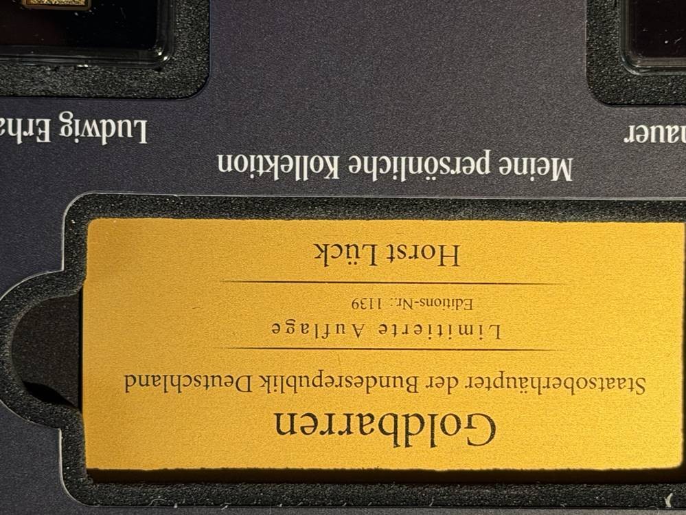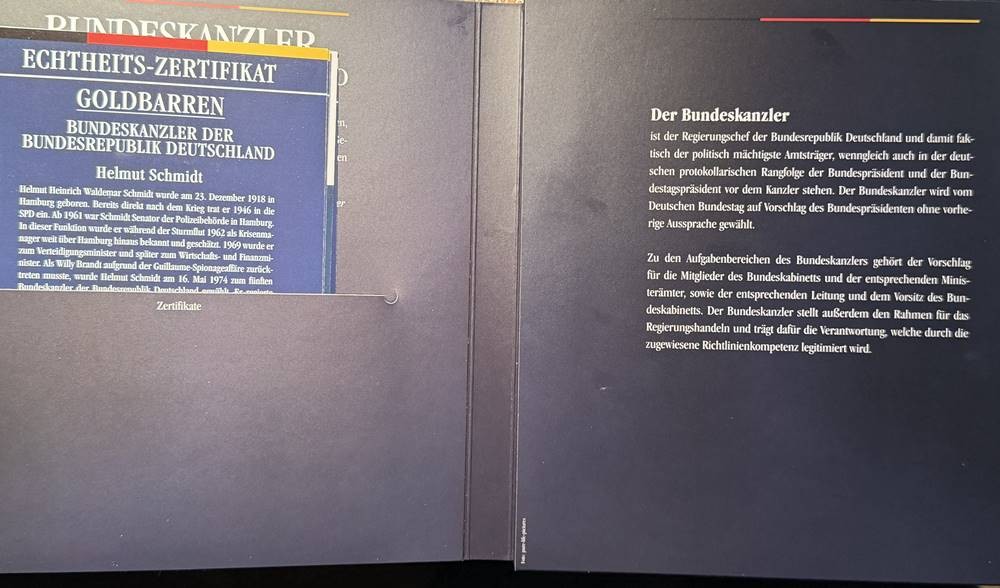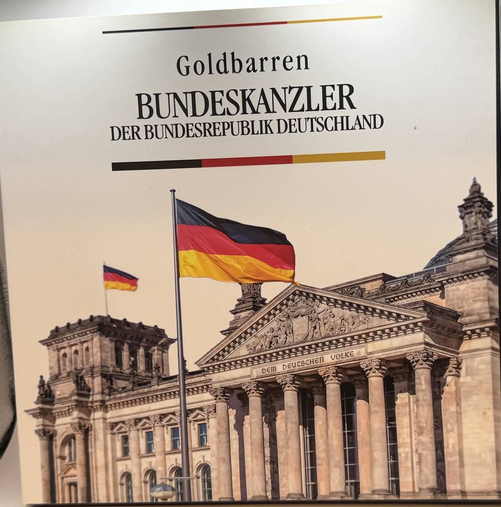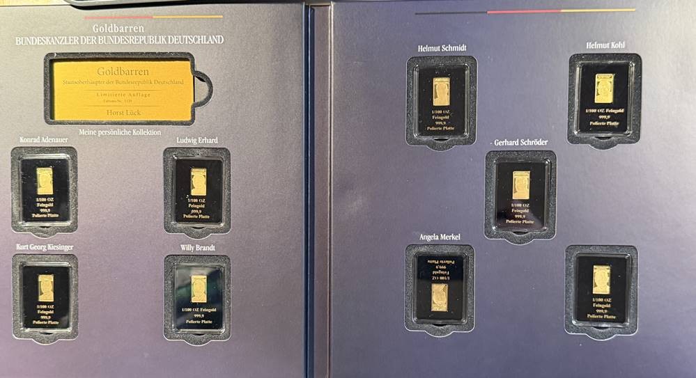 Mappe "Goldbarren Bundeskanzler der BRD"mit 9x 1/100 Unze Feingold-999,9-, (ca. 3,11 gr.?)polierte Platte, in Display, mit Zertifikaten, limitierte Auflage