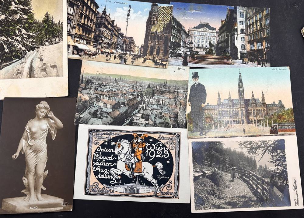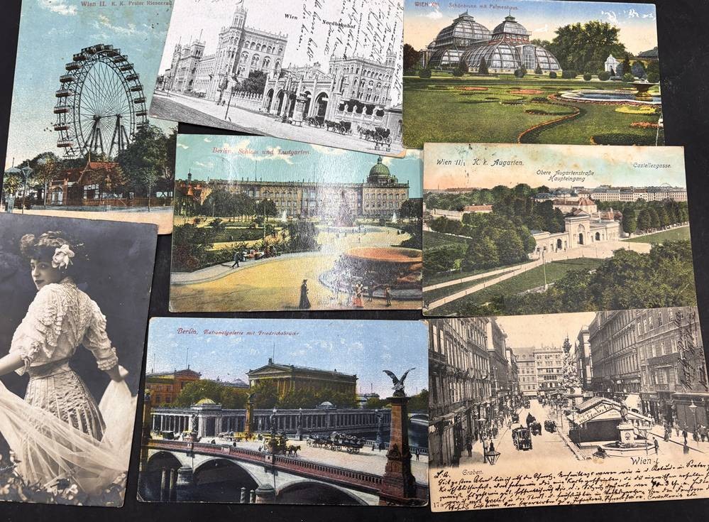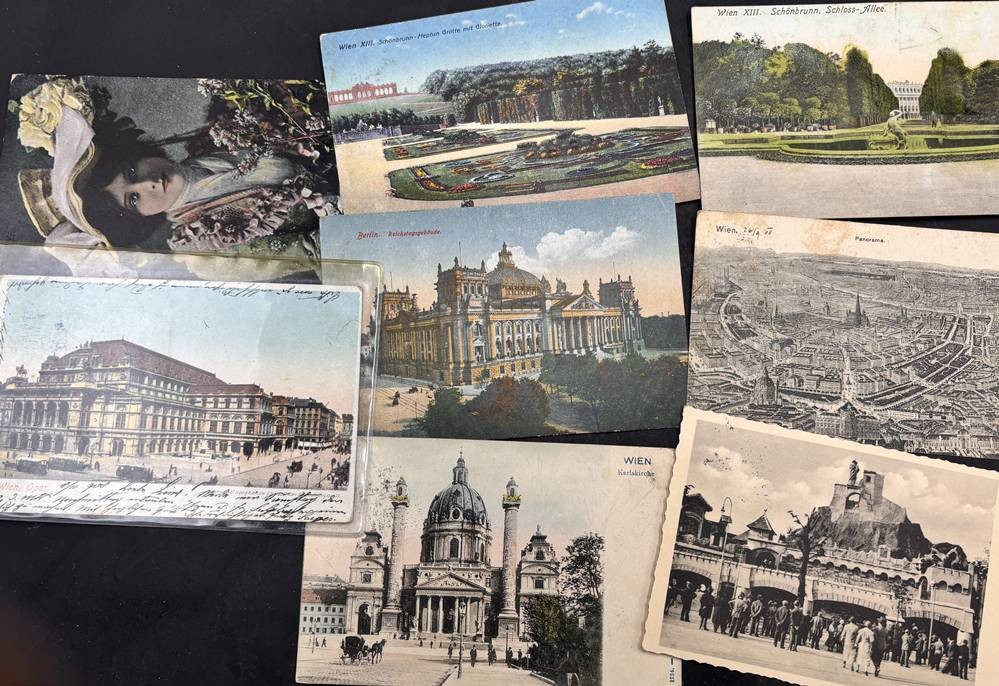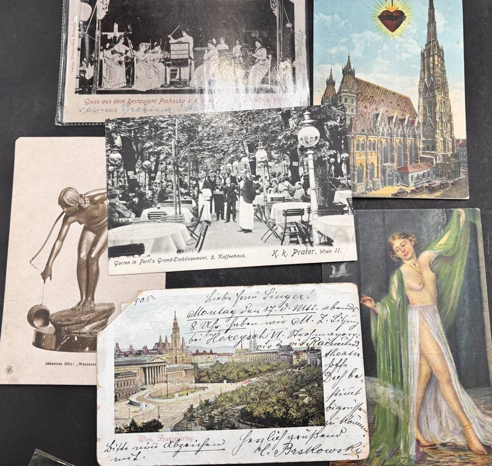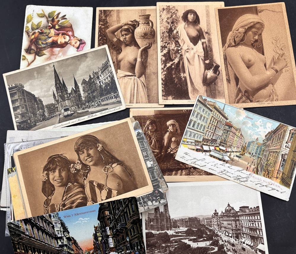 über 60 alte Postkarten, alle Vorkrieg, hpts. Wien-Ansichten sowie div. leicht bekleidete Mädchen, grossteils gelaufen, anbei ein Schulsparbuch [1]