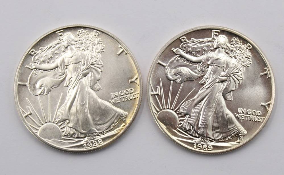 Zwei one Dollar 1988 u. 1989, Amerika, jeweils 1 Unze Feinsilber 999, 63,2 Gramm [1]
