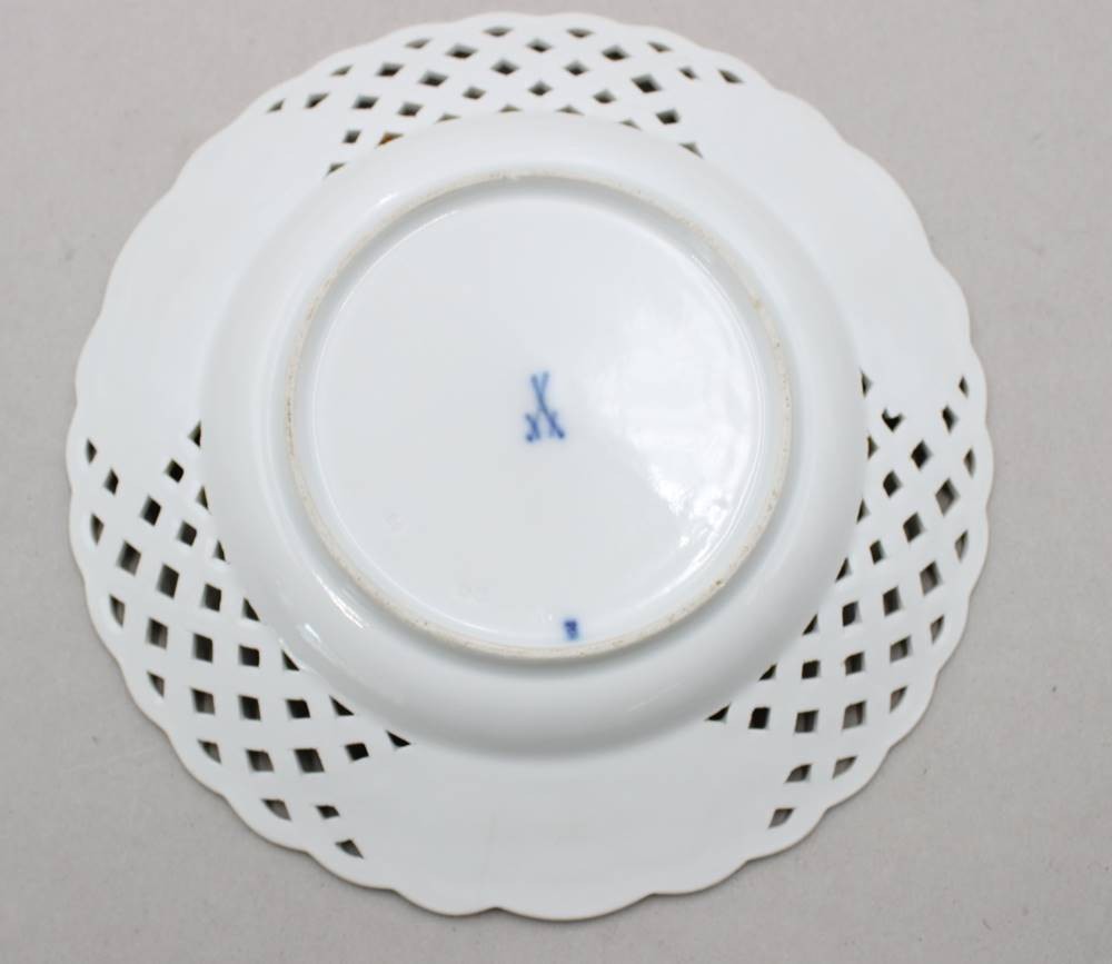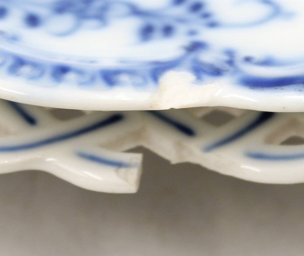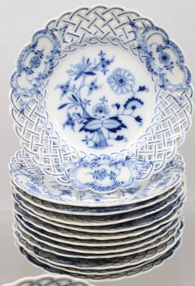15x Durchbruchteller, Meissen, Schwertermarke, Zwiebelmuster, 1x bestossen und 1x mit Chip, je 2 Schleifstriche, D-20,5cm [1]