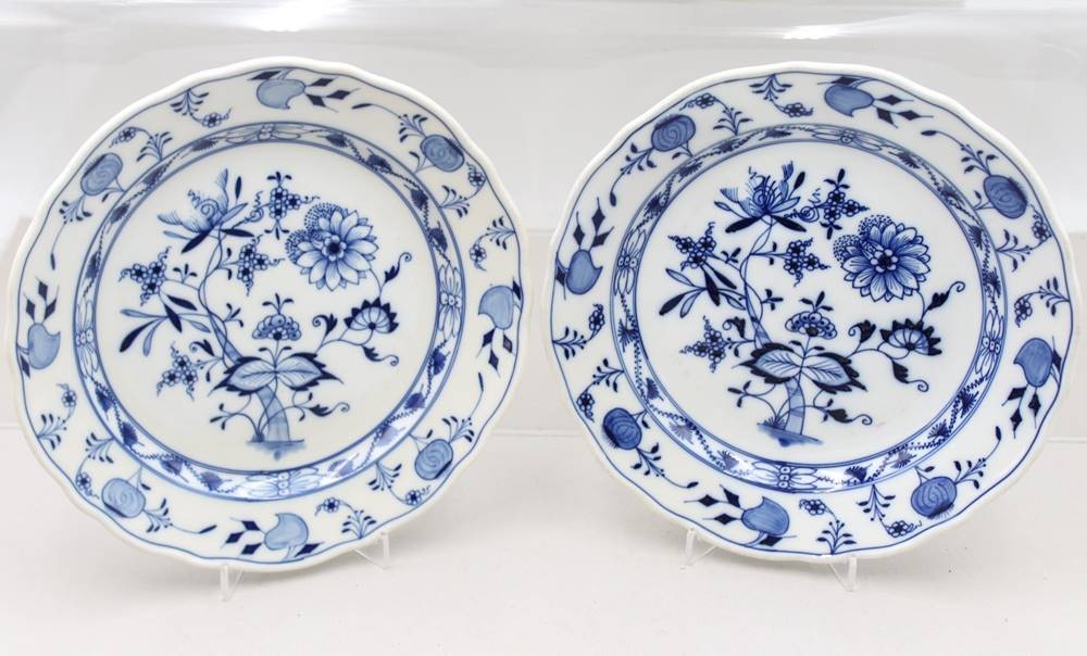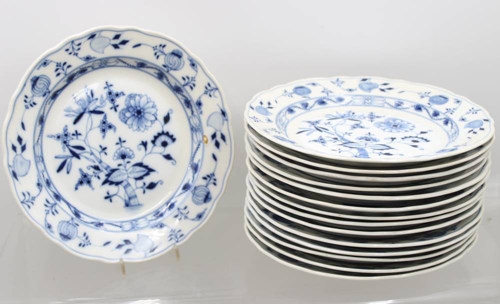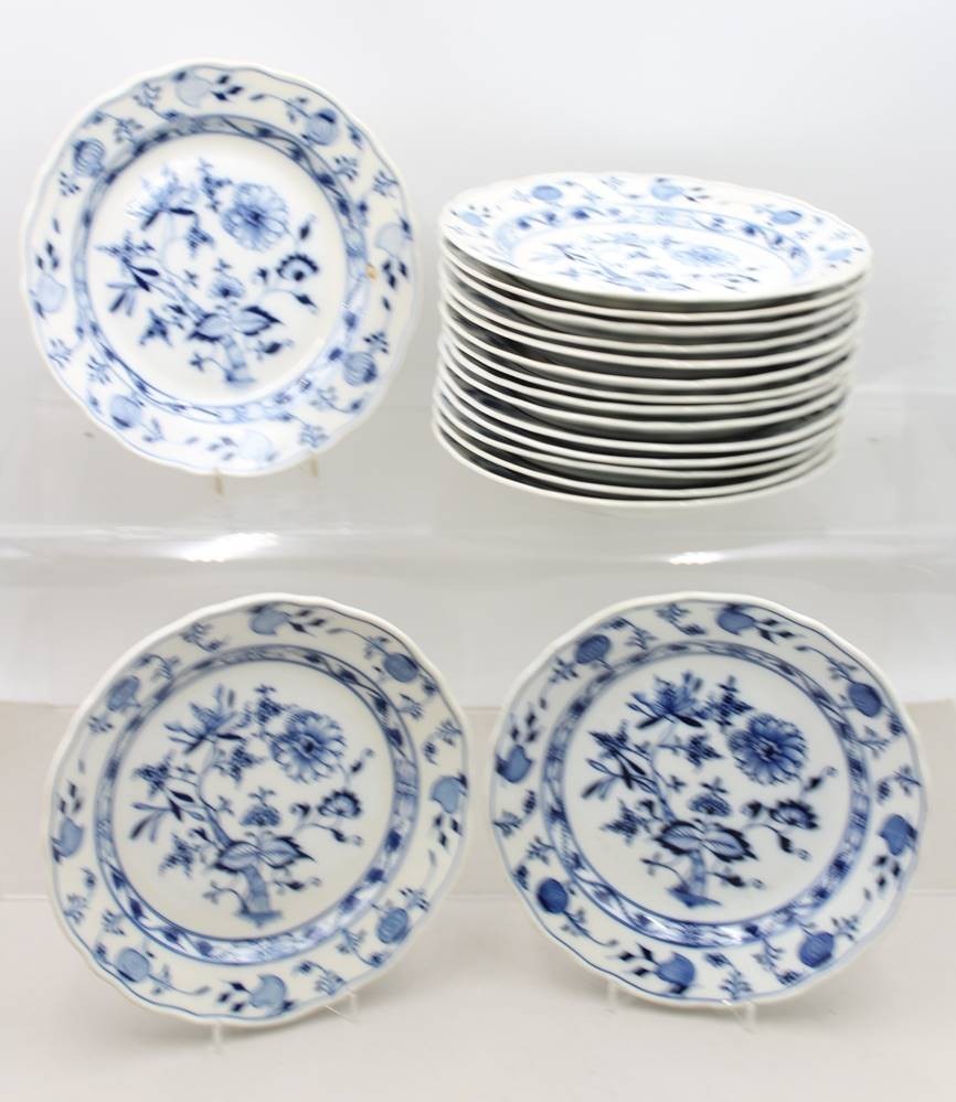 17x flache Teller, Stadt Meissen, Zwiebelmuster, teilw. kl. Brandfehler, ca. D-25cm [1]
