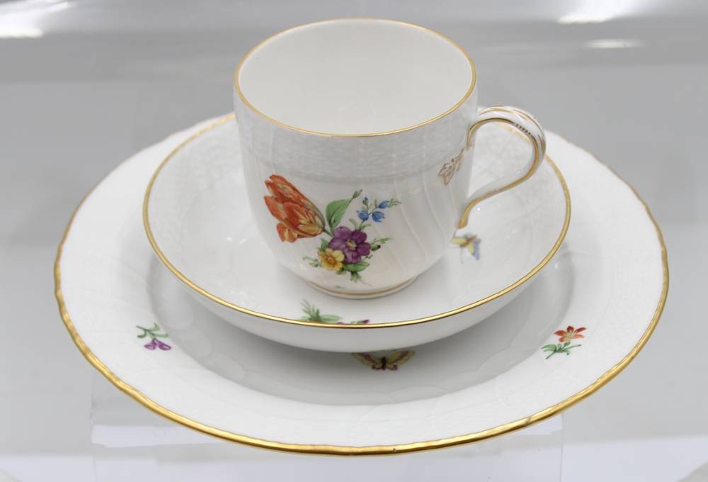 20 Kaffeeserviceteile, KPM Berlin Neuosier, Bunte Blumen und Insekten, 8x Tassen mit U.T. und 4 Kuchenteller, Tassen ca. H-7cm [1]