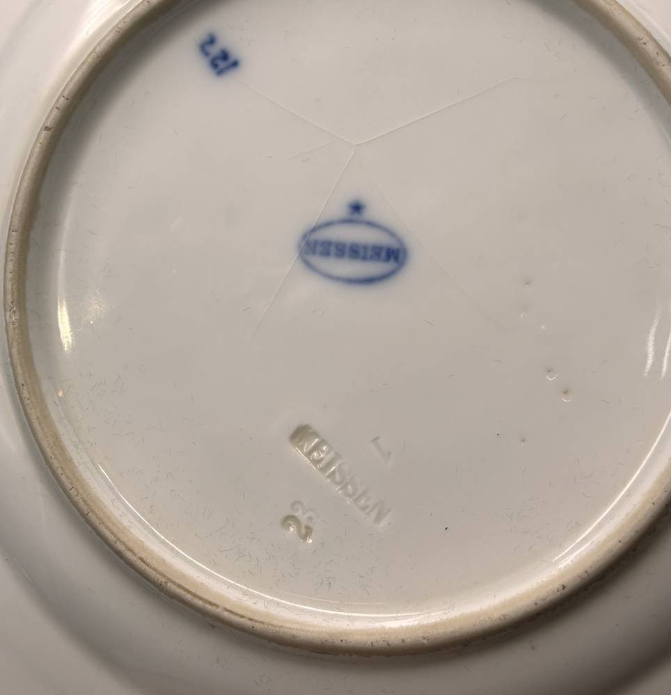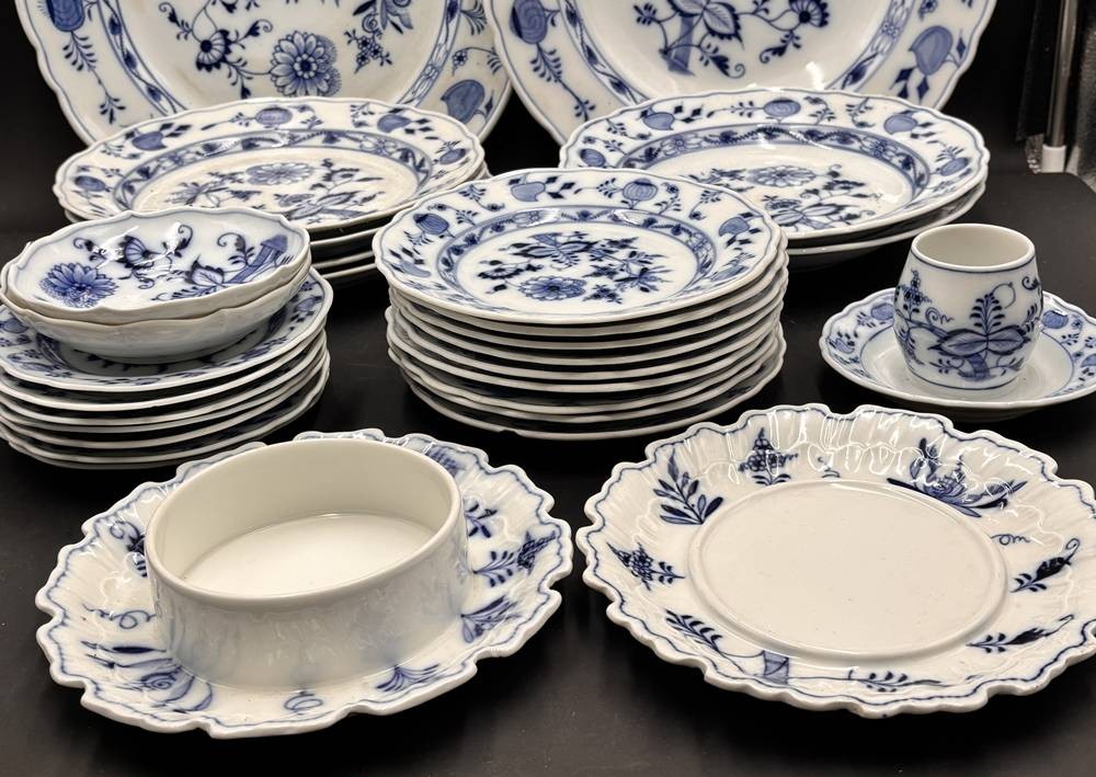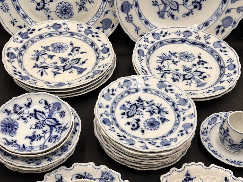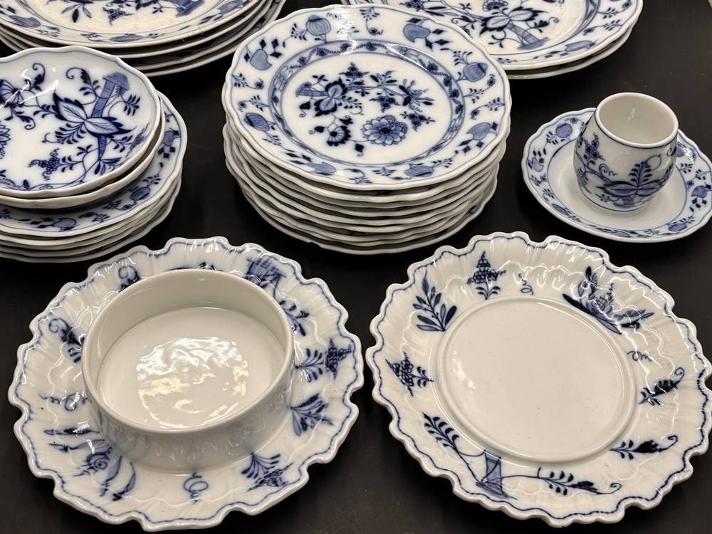 29xdiv. Serviceteile "Stadt Meissen" Zwiebelmuster, um 1920, einige Teller mit Chips bzw. Altrisse, Deckel für 3 Teile fehlen [1]