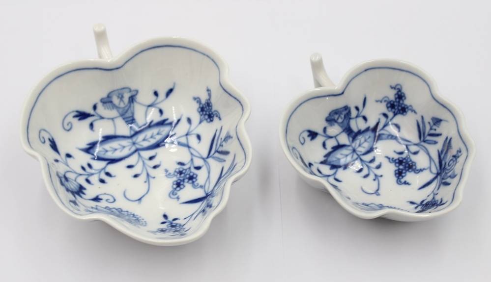2x Blattschalen, Meissen, Zwiebelmuster, gr. Schale mit 3 Schleifstrichen, kl. Schale 1. Wahl, ca. H-4 u. 3cm [1]