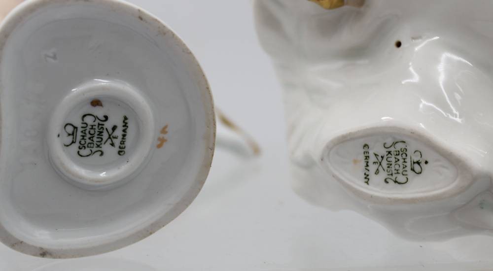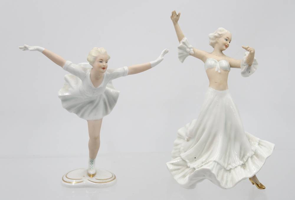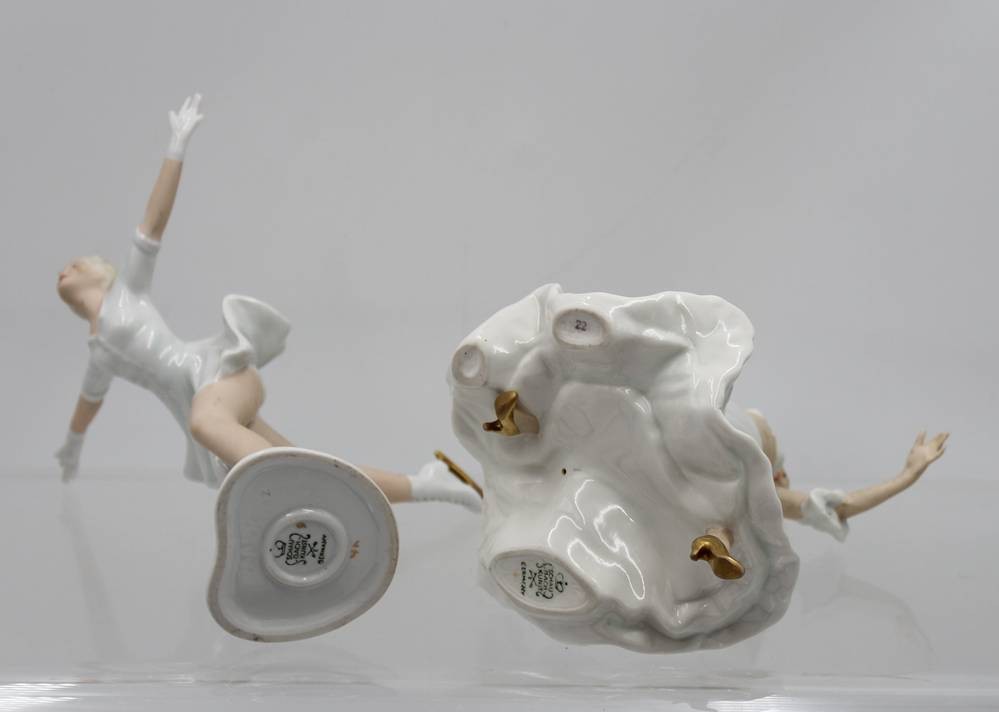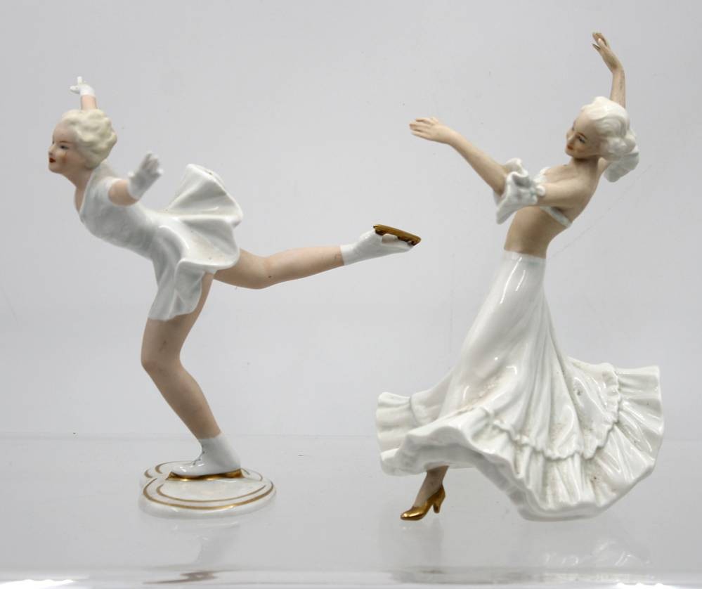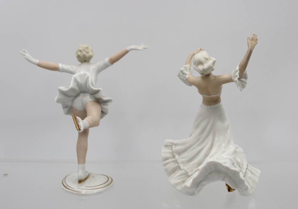 2x div. Figuren, Schaubach Kunst, Tänzerin uns Schlittschuhläuferin (Finger beschädigt), ca. H-19,5cm [1]